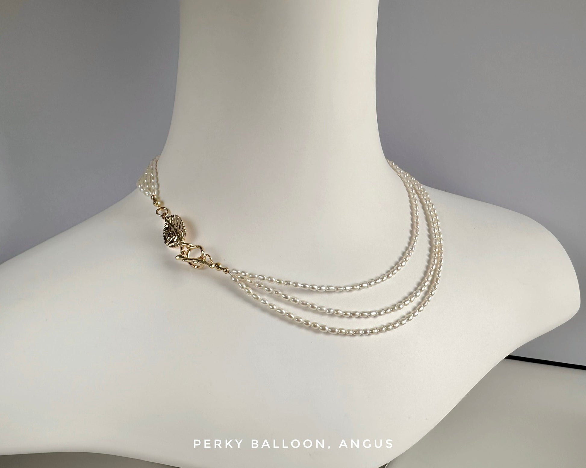 2-3mm迷你巴洛克淡水珍珠,超強光白色,黃銅鍍金樹葉toggle 扣,三層頸鏈,最內層大約45 cm