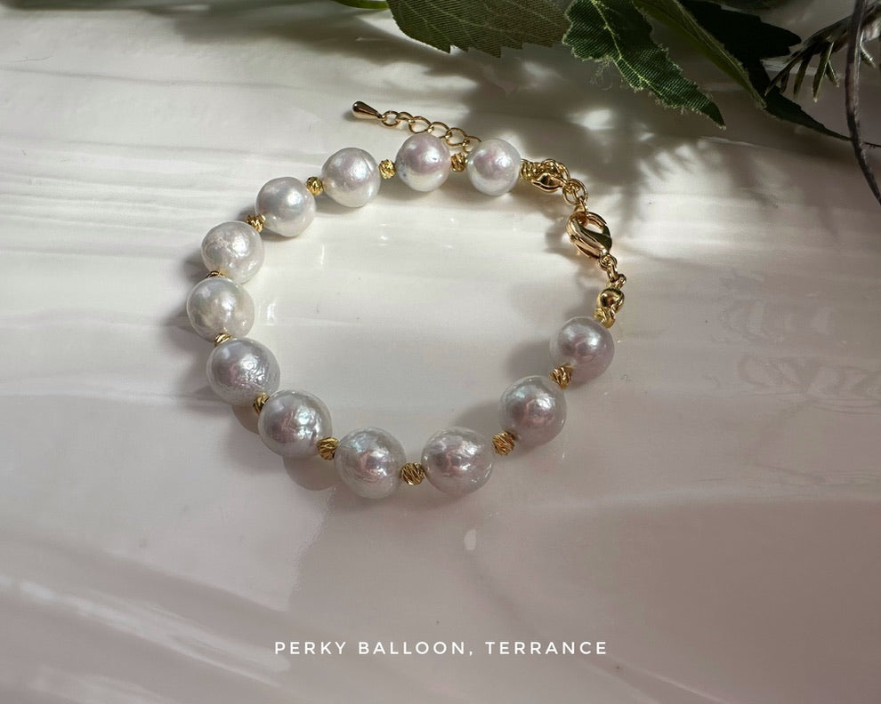 8-10mm 近圓形巴洛克淡水珍珠,糖紙幻彩冷光白色,微微灰,呢種珍珠因為表面唔平滑,所以有天然嘅閃爍感,效果搶眼,手鏈連扣長度大約15 + 5cm
