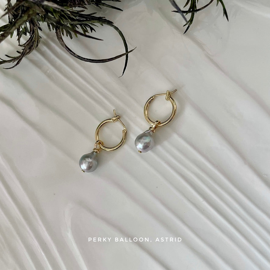 9-9.5 mm巨大巴洛克日本Akoya,天然灰藍色幻彩,黃銅鍍金耳扣,圈圈直徑大約1.6 cm,整體長度大約3cm