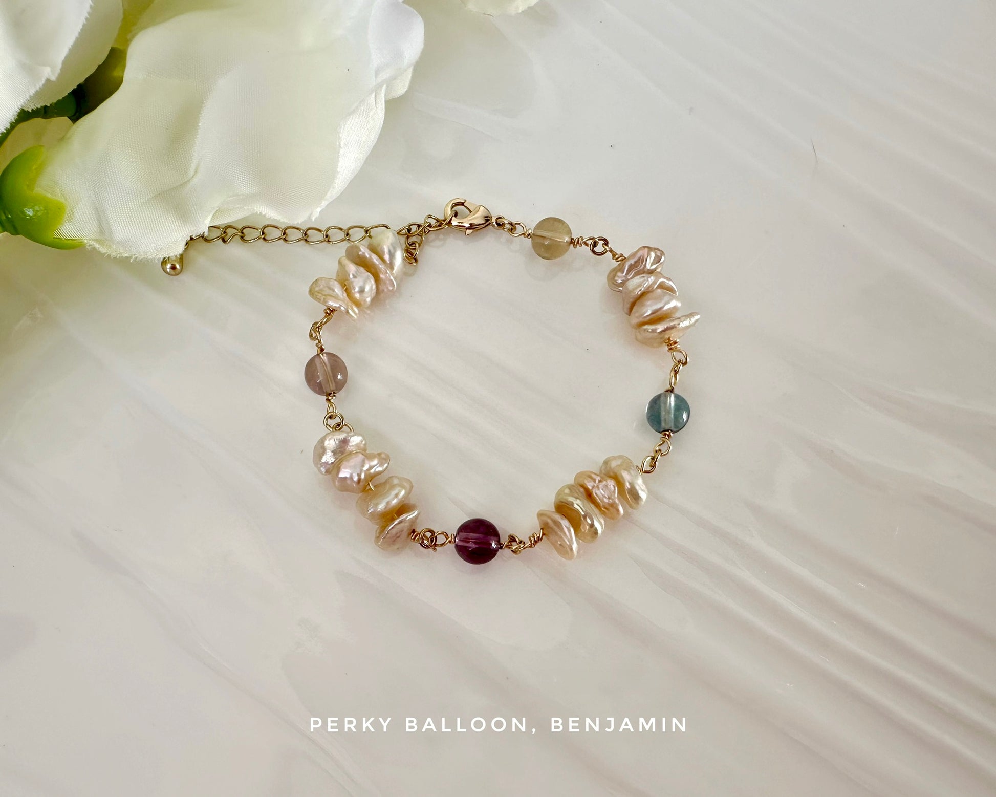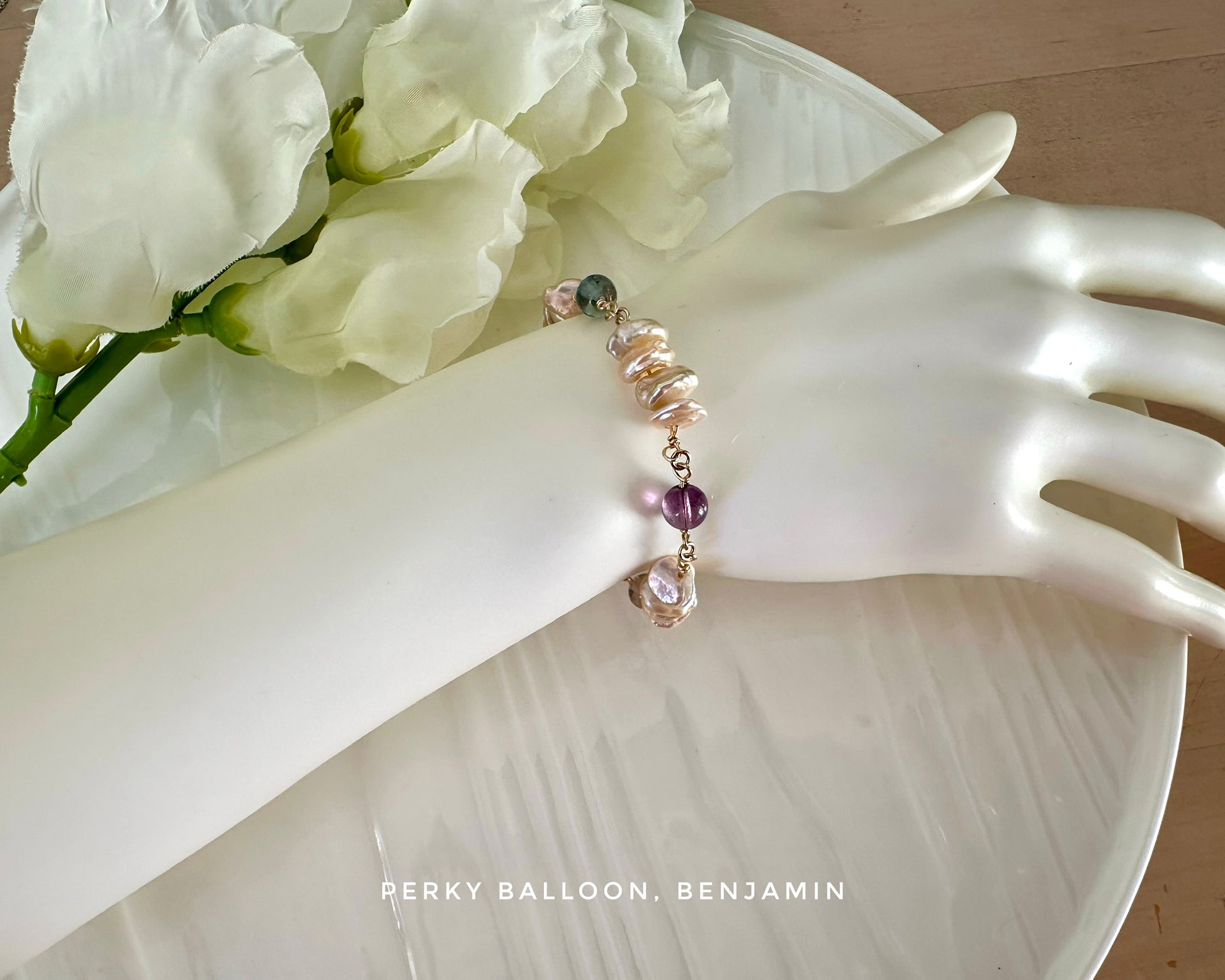 ~8mm 花瓣形巴洛克淡水珍珠,金屬粉橙色+ 6mm螢石,手鏈連扣長大約15+5 cm