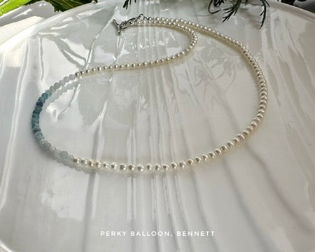 4.5 mm近圓形/小橢圓淡水珍珠,漸變色排列海藍寶,頸鏈連扣長度大約50 cm