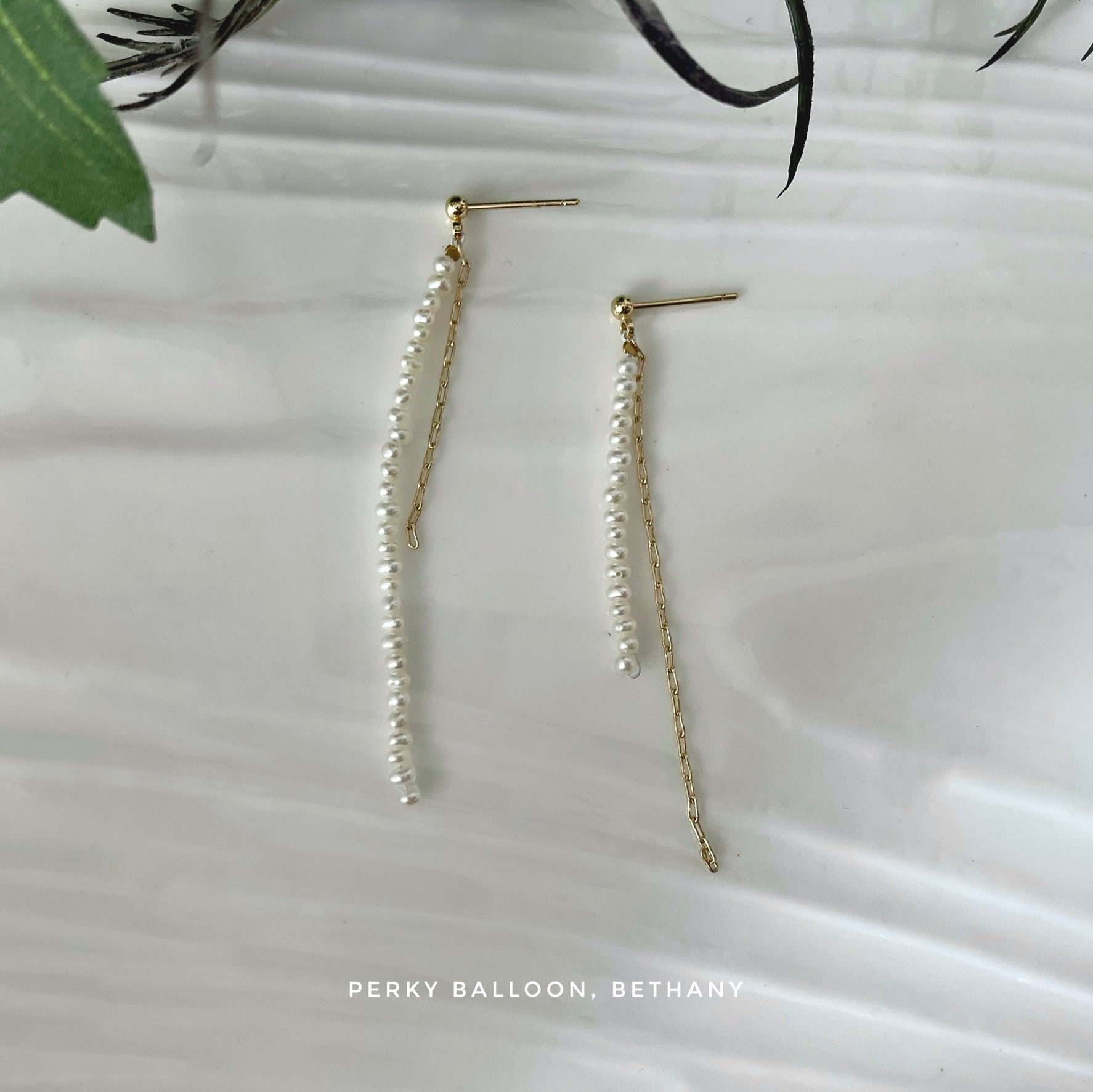 2-2.5 mm巴洛克淡水珍珠,超閃,黃銅鍍金豆豆耳釘,耳針部份係銀鍍金,整體長度大約6cm