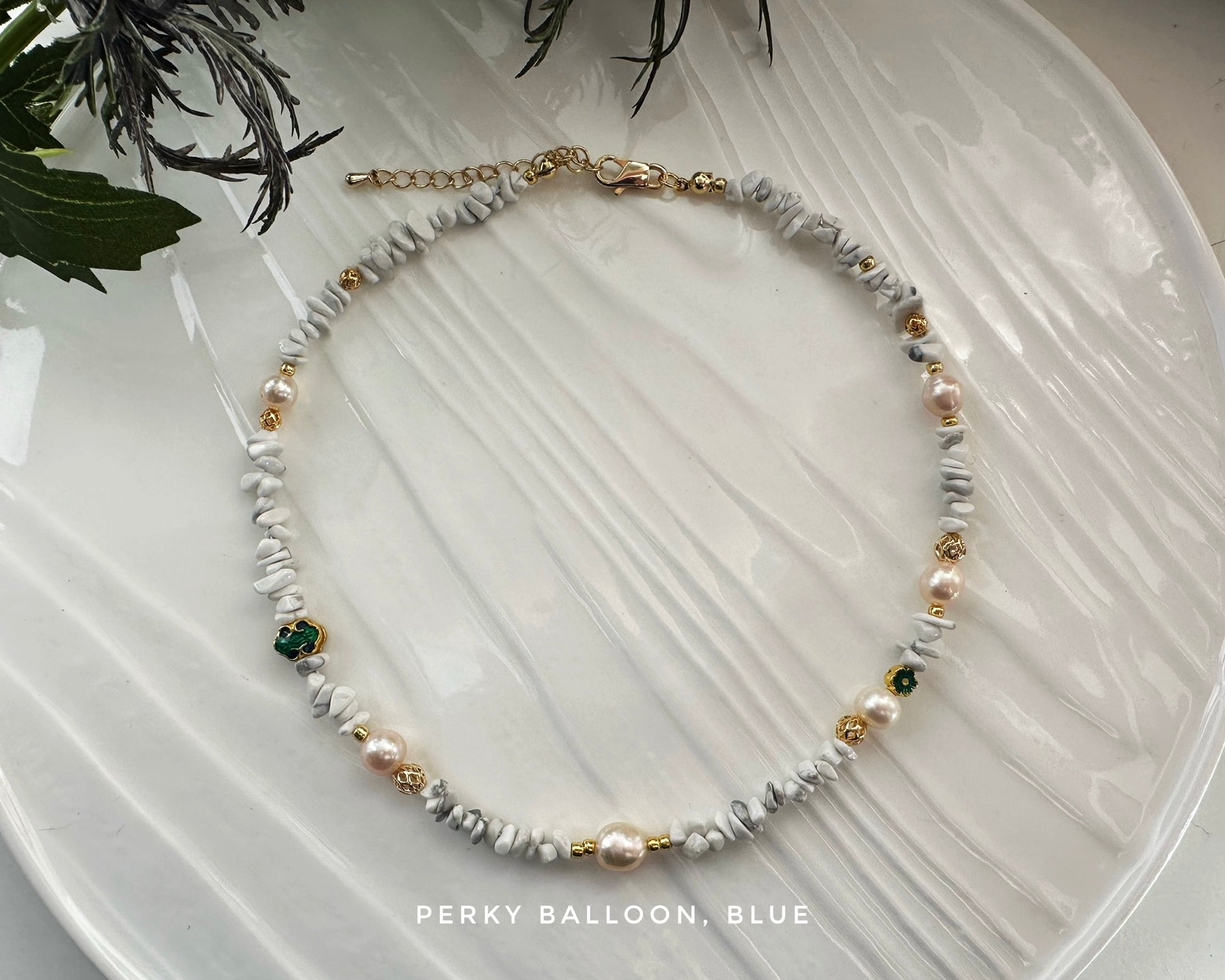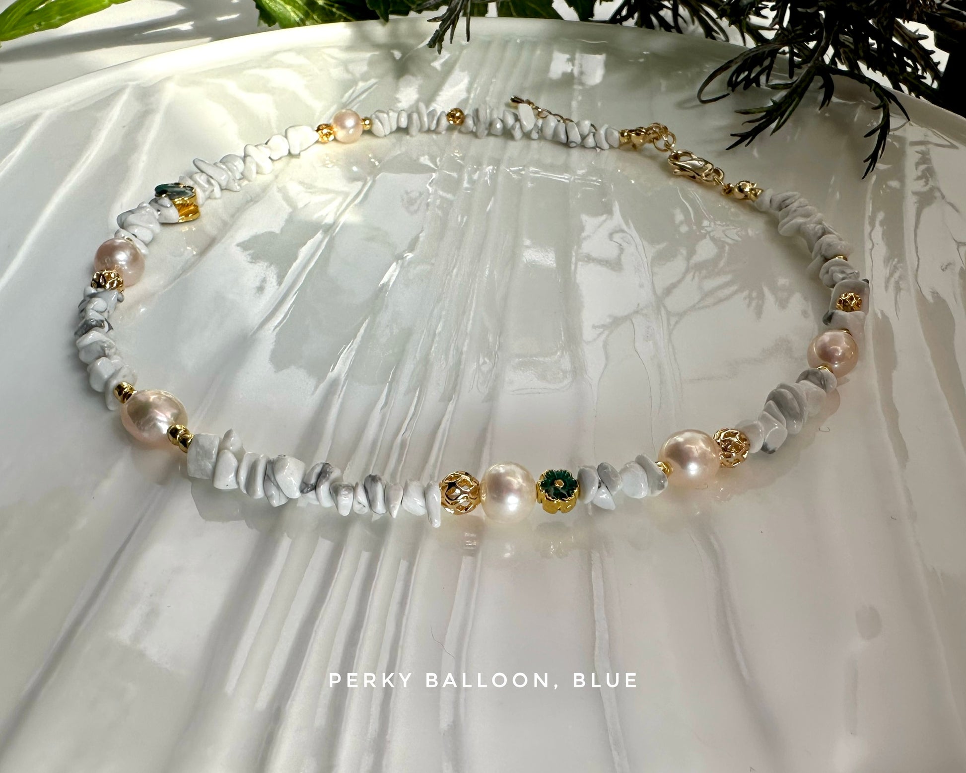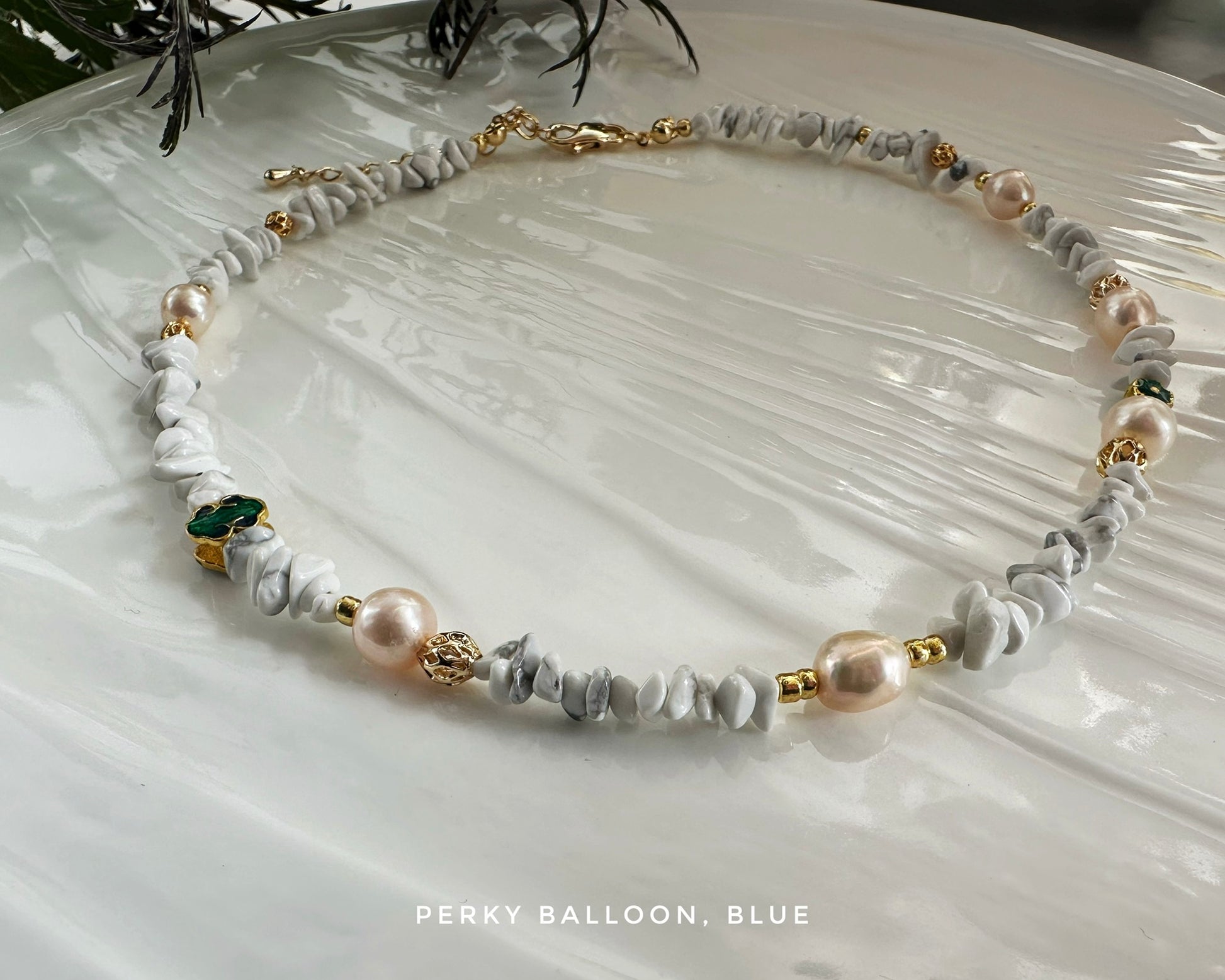8-9mm巴洛克淡水珍珠+白松石+景泰藍,珍珠顏色可選白色/橙色/紫色,上圖sample粉橙色,頸鏈連扣長度大約40+5 cm
