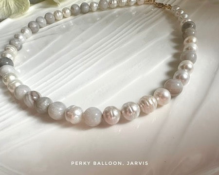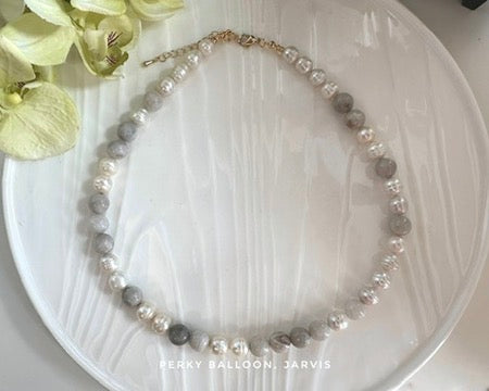9-10mm巴洛克淡水珍珠,灰瑪瑙,頸鏈連扣長約45+5cm