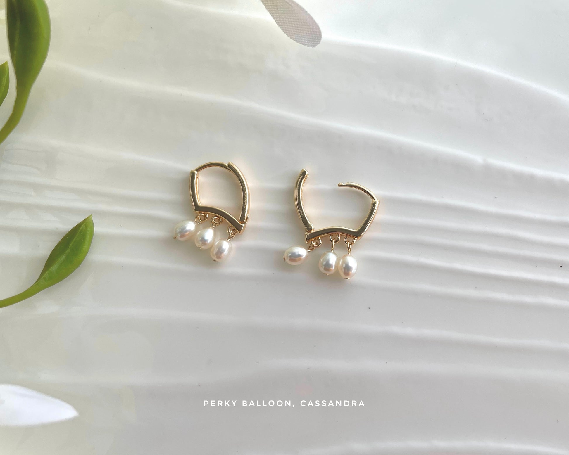 4mm 橢圓形淡水珍珠,三連珠黃銅鍍金耳扣,整體總長約2.2 cm