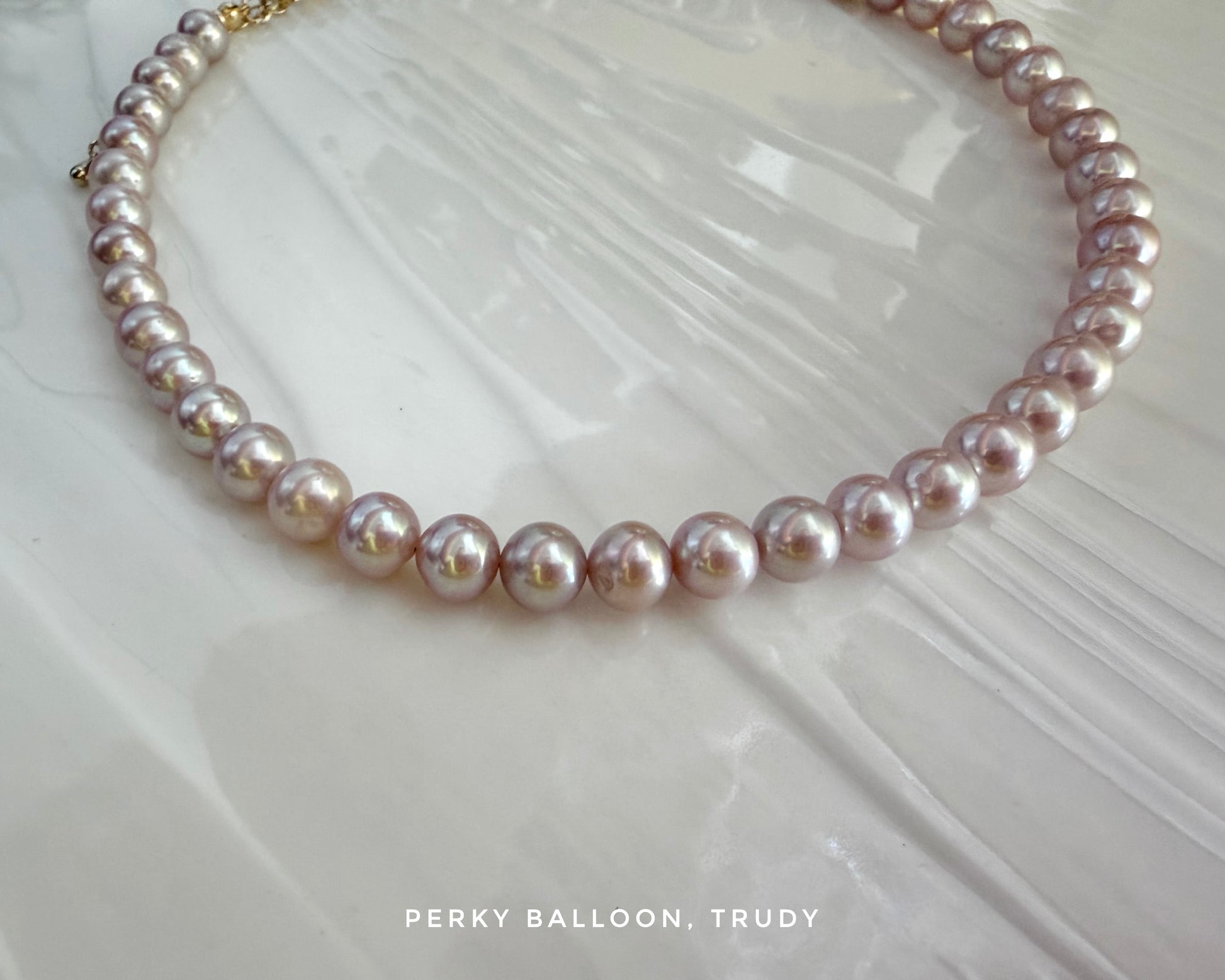 8-8.5mm 近正圓淡水珍珠,仙女粉紫色,超強光,皮層潤澤,微小瑕,送禮自用都非常得體,頸鏈連扣長約40+5 cm