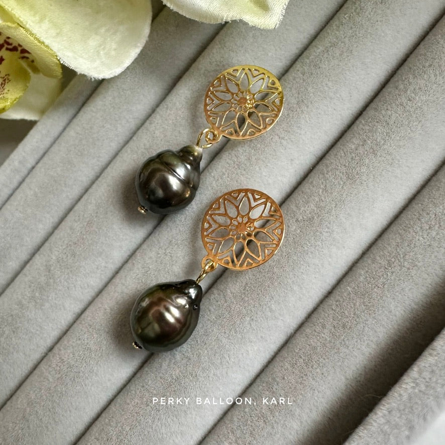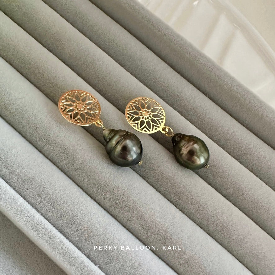 10 mm水滴形巴洛克大溪地珍珠,帶點啡tone嘅綠色,黃銅鍍金通花蕾絲耳釘,整體長度大約3cm