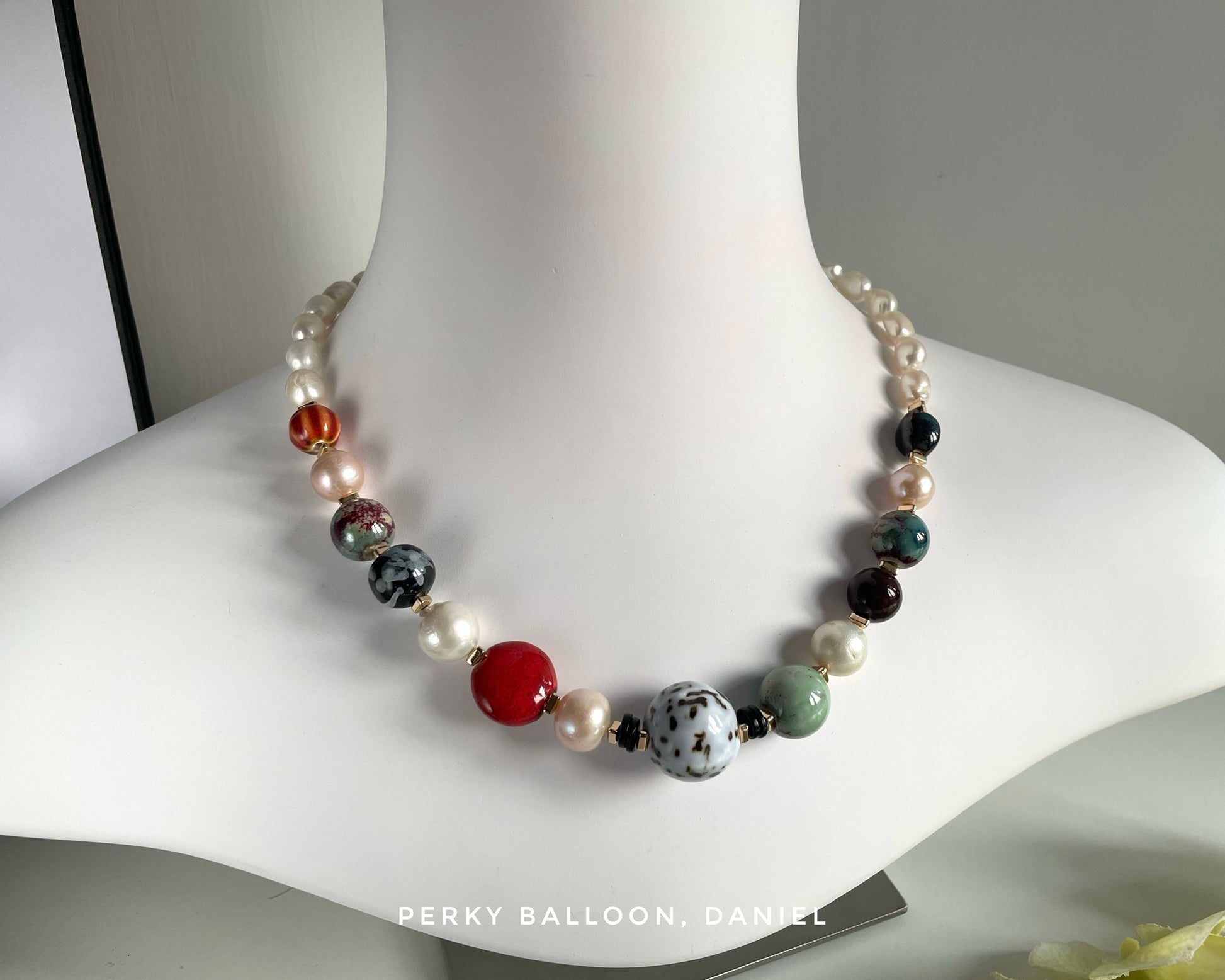 9-13mm巴洛克淡水珍珠+ 10至20 mm陶瓷珠,歐美whimsical style,頸鏈連扣長約50+5 cm