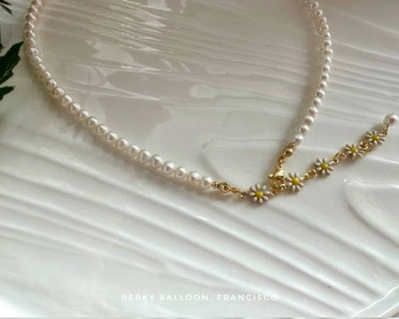 5mm圈紋淡水珍珠,強光帶幻彩,感覺清爽好心情小雛菊頸鏈,鏈尾可以隨意扣調節長度40-47cm,公仔佩戴效果45 cm