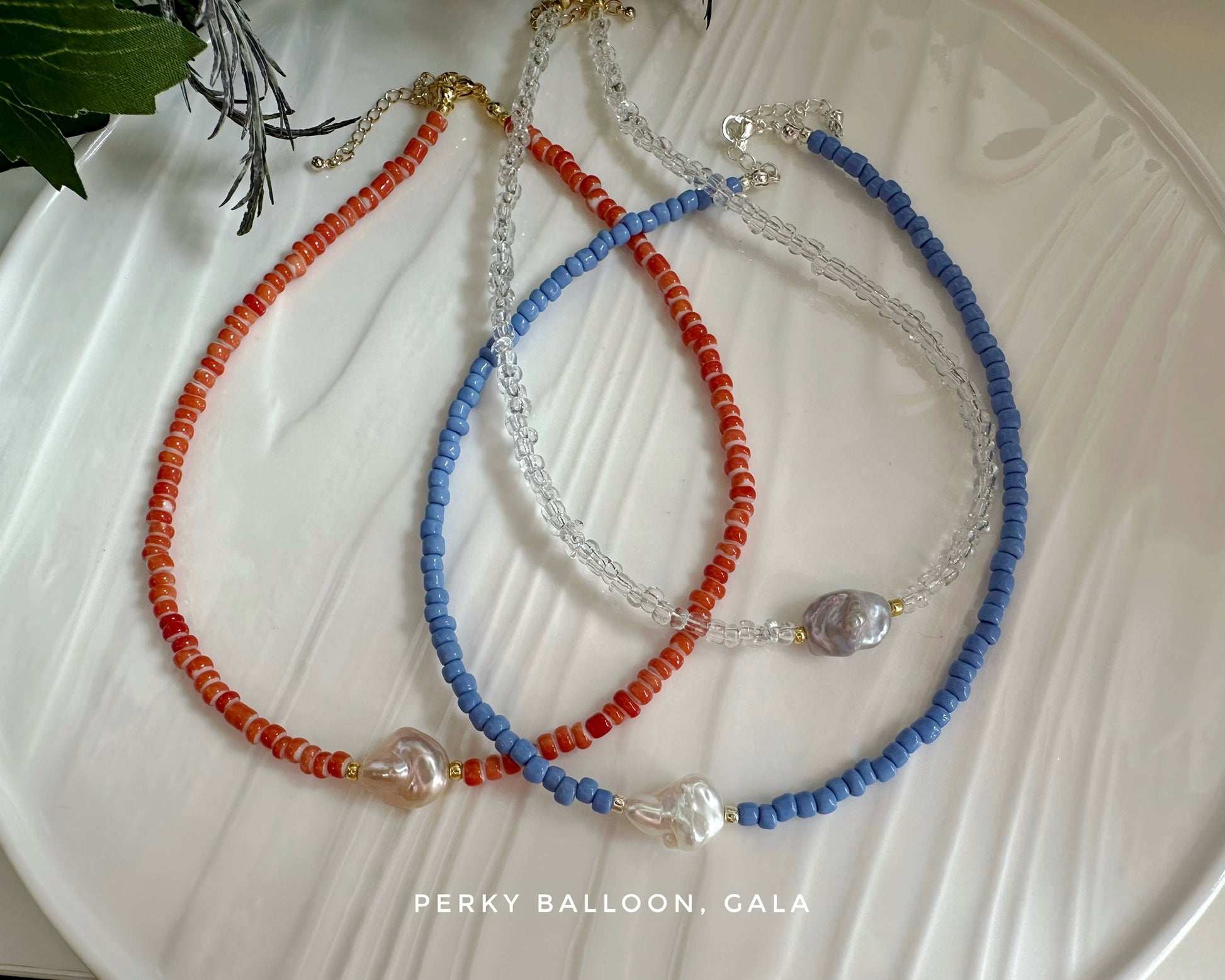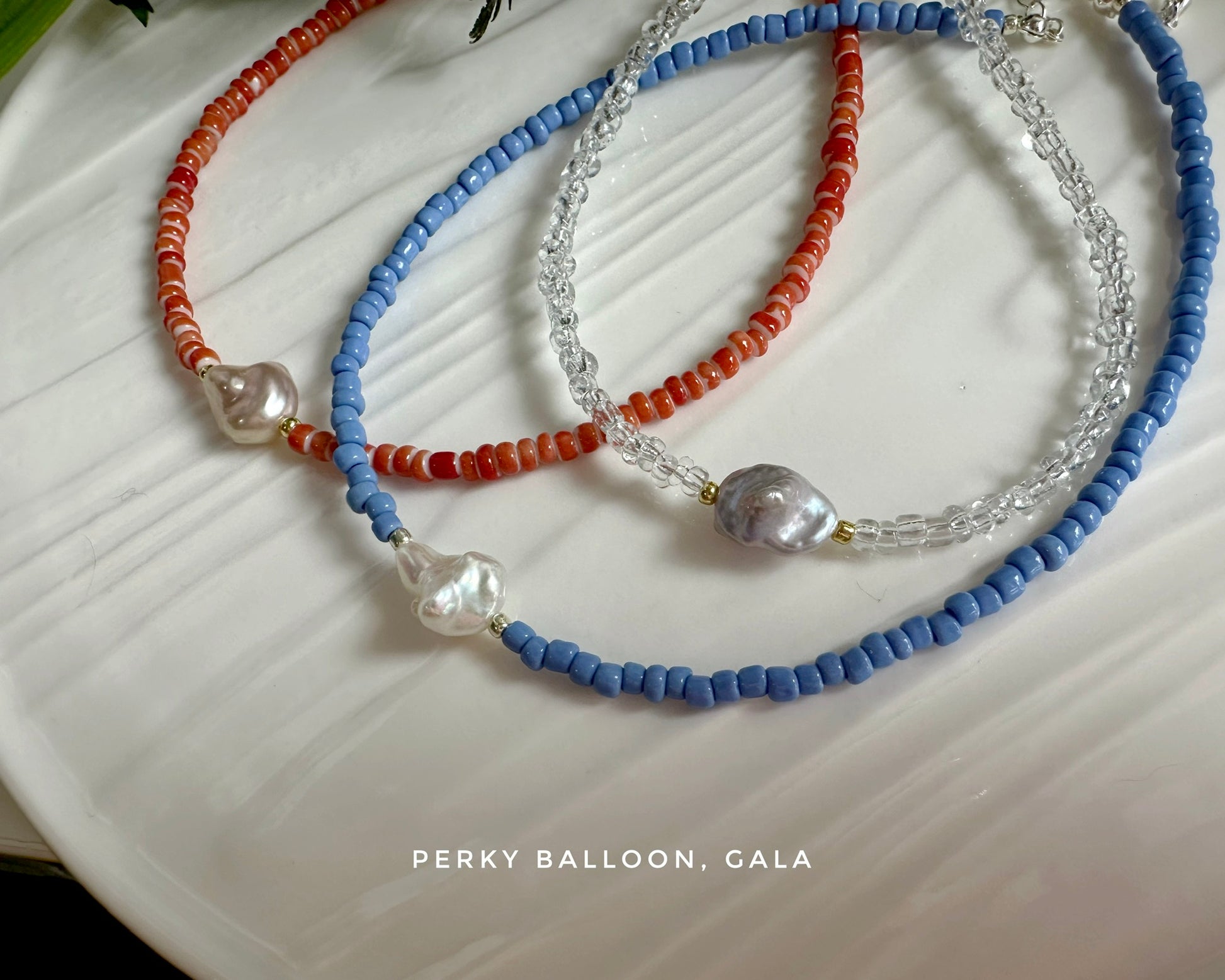 11-12mm一嚿雲巴洛克淡水珍珠,4mm彩色玻璃珠,頸鏈連扣長約38+5cm,中間珍珠可選白色/橙色/紫色,玻璃珠仔亦有多種顏色可以揀,請參考後面圖片,請喺order special instruction 內備注玻璃珠仔顏色😉