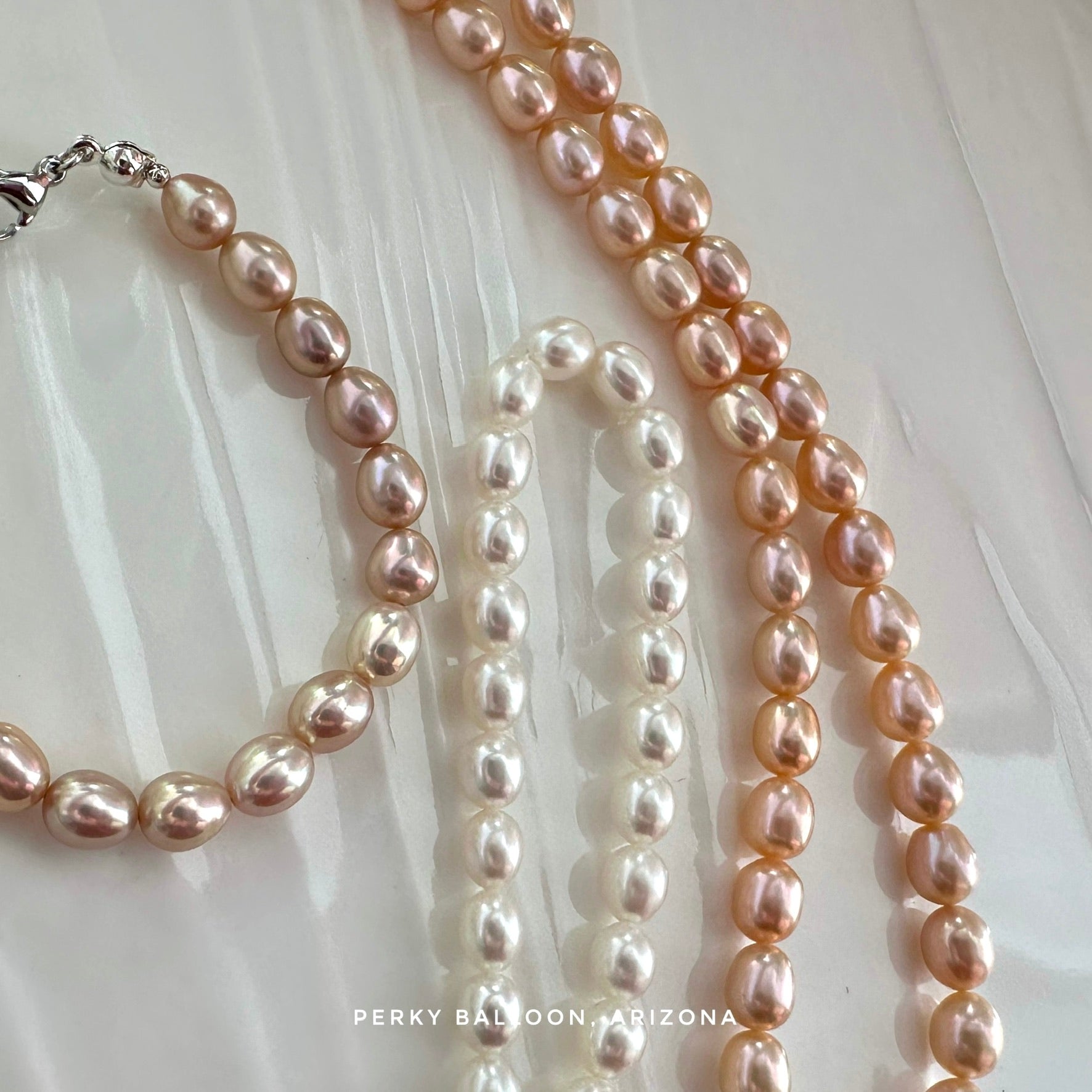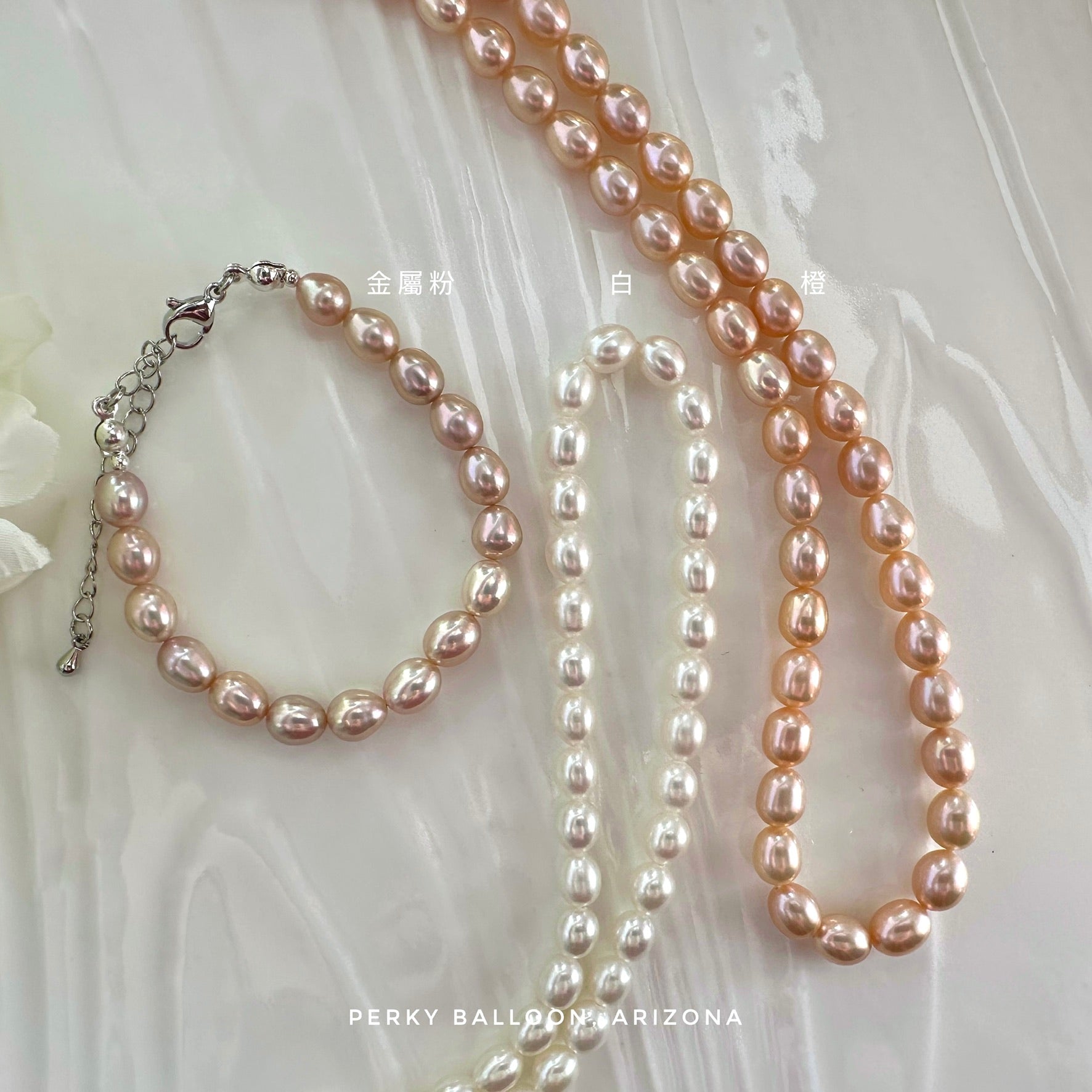 6-7 mm橢圓形淡水珍珠,唔講得笑嘅無敵光澤,上手效果超級閃亮,可以揀金粉色/橙色/白色,手鏈連扣長約15+5 cm