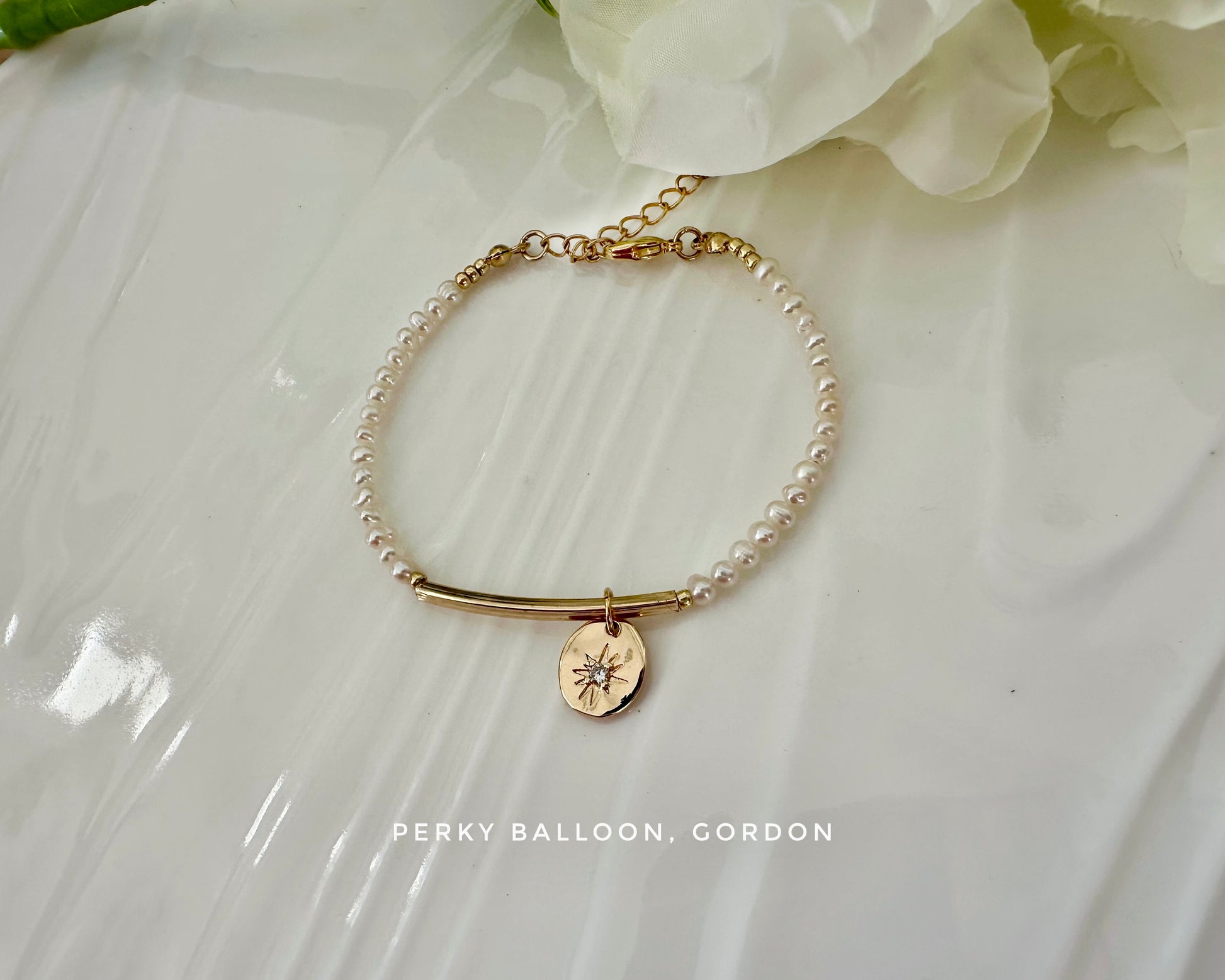 2.5-3mm橢圓形淡水珍珠,黃鍍鍍金charm,手鏈連扣長度大約15+5 cm