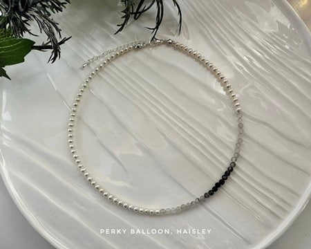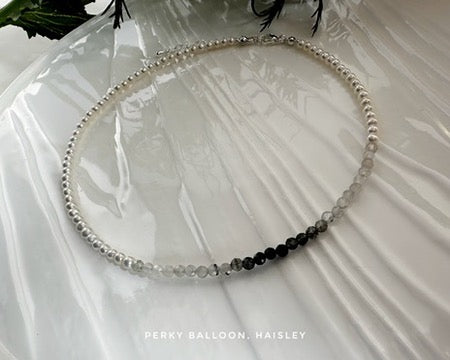 4-4.5 mm近圓形淡水珍珠,銀白色超強光,漸變色排列黑髮晶,淡淡嘅墨彩鎏光,飄住紙墨香氣嘅頸鏈,連扣長度大約38+5 cm