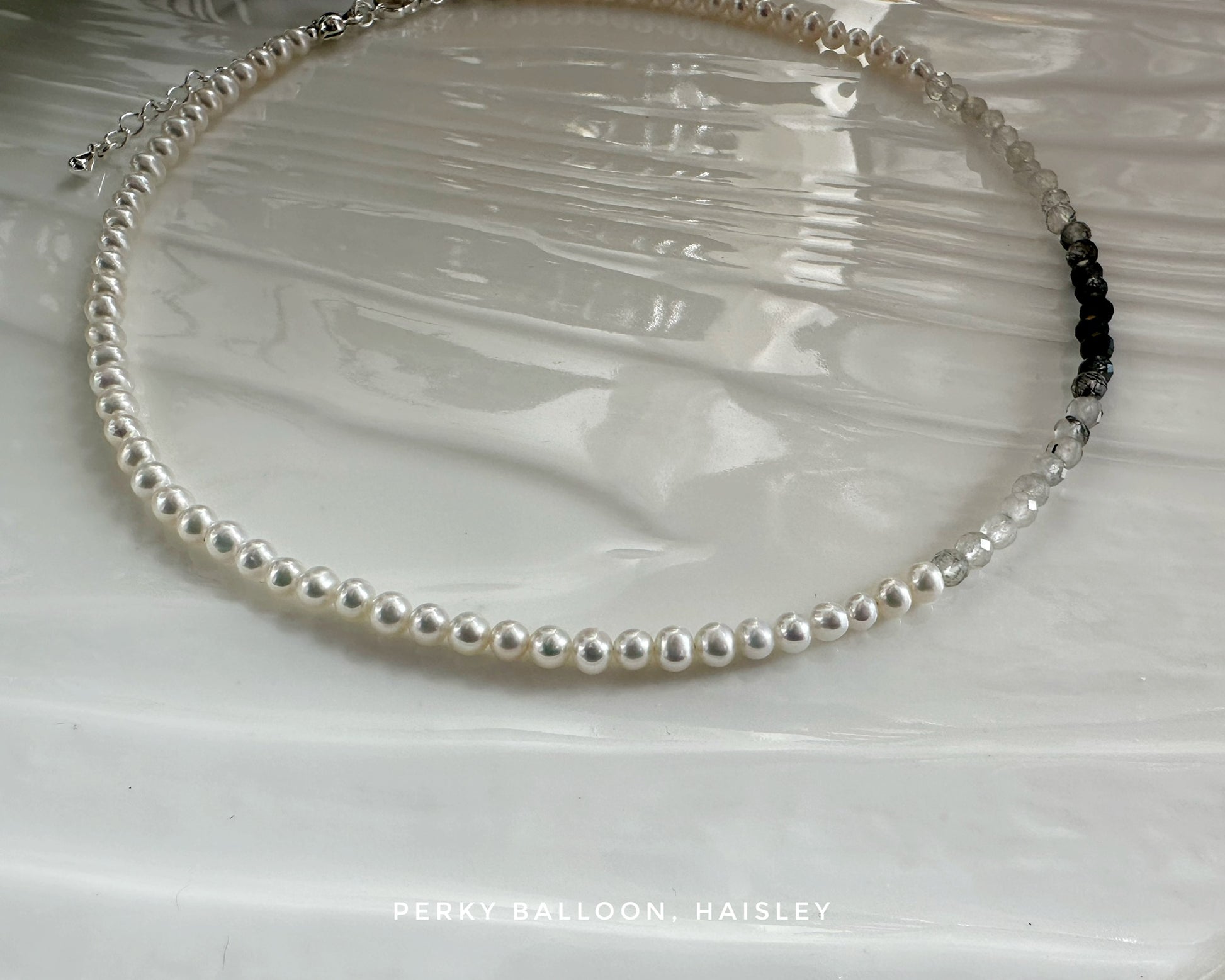 4-4.5 mm近圓形淡水珍珠,銀白色超強光,漸變色排列黑髮晶,淡淡嘅墨彩鎏光,飄住紙墨香氣嘅頸鏈,連扣長度大約38+5 cm
