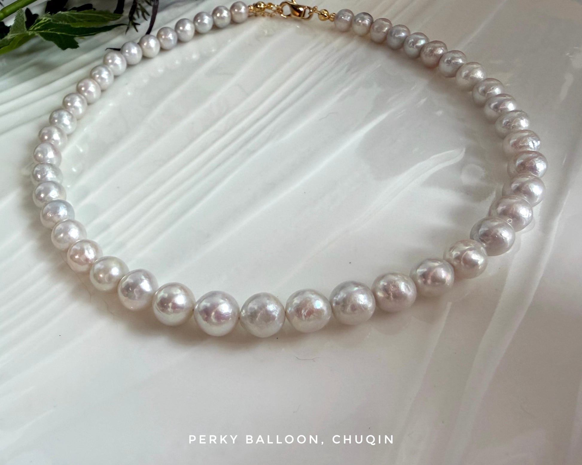 8-10mm 近圓形巴洛克淡水珍珠,糖紙冷光白色,帶天然幻彩微微灰,係雪地上耀眼陽光既閃爍感,上身效果青春搶眼,頸鏈連扣長度大約40+5 cm