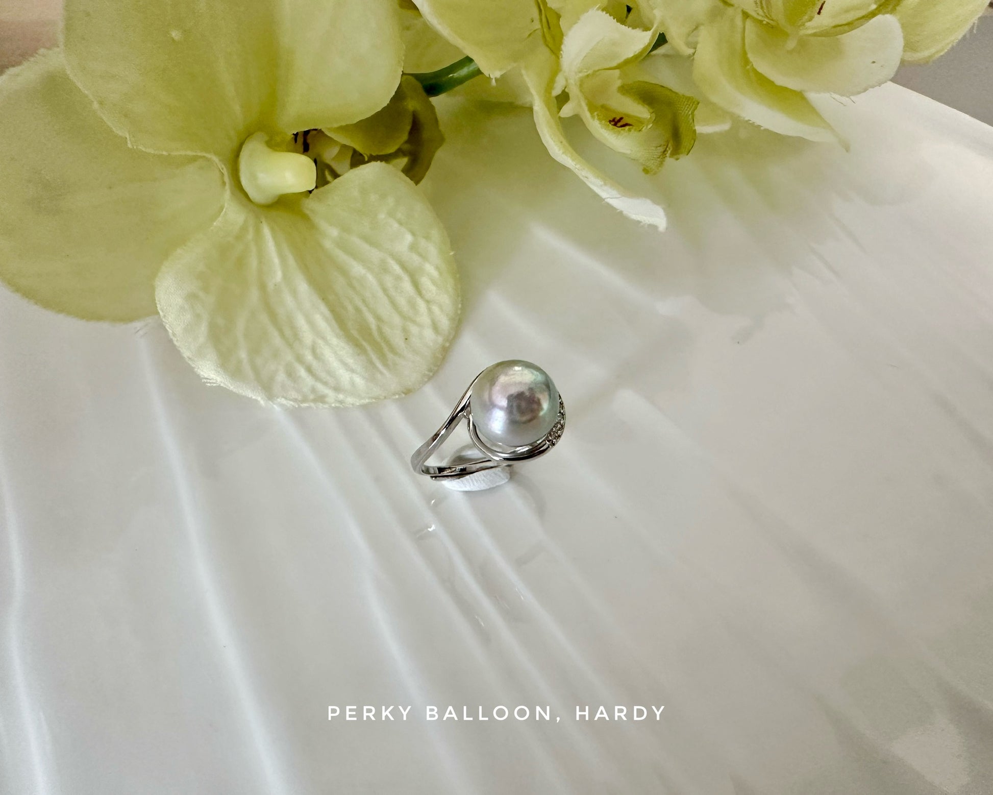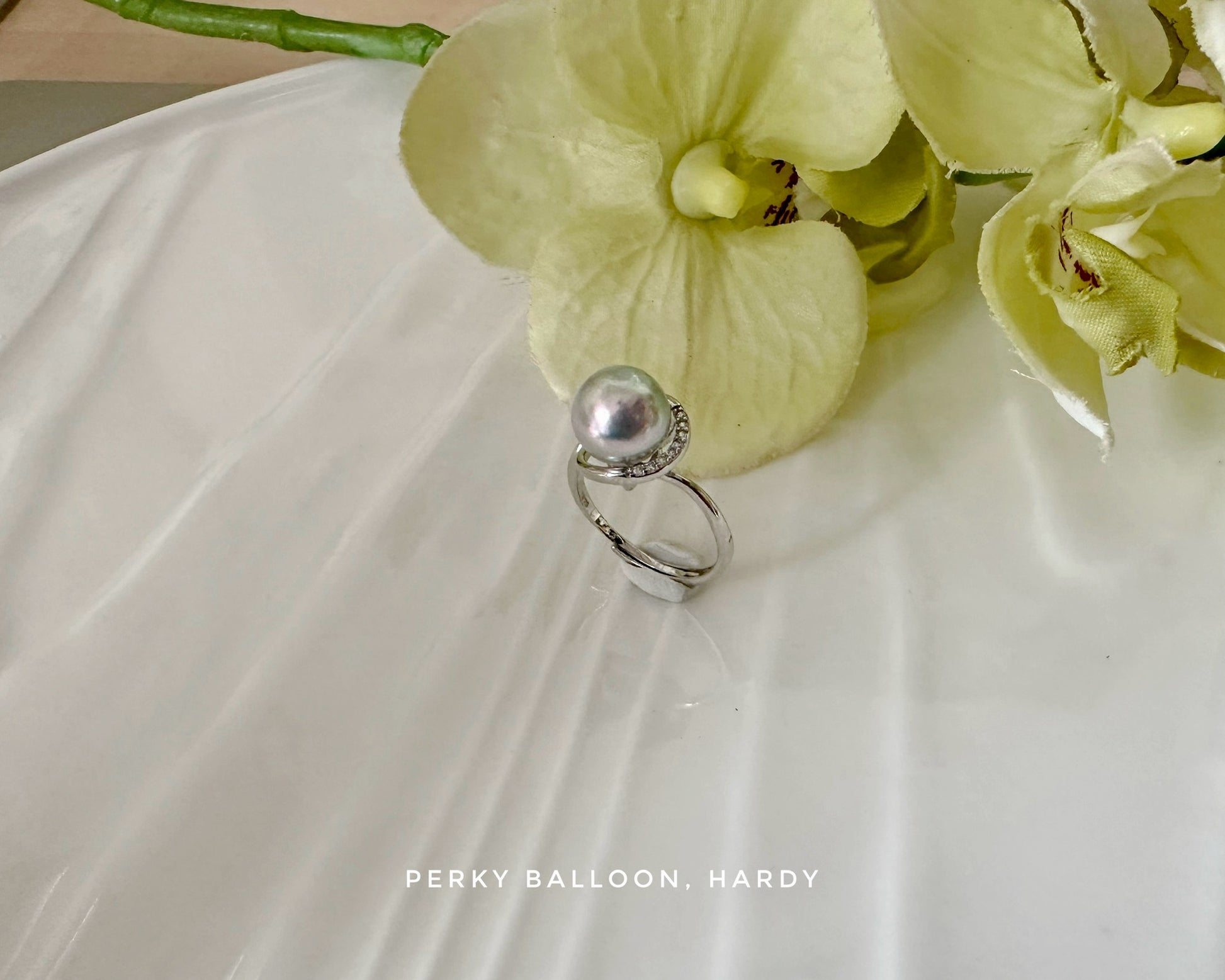 9mm近圓形巴洛克日本Akoya,天然灰藍色幻彩,金屬光澤,925純銀鑲鋯石活口戒指,尺寸可以自行調校