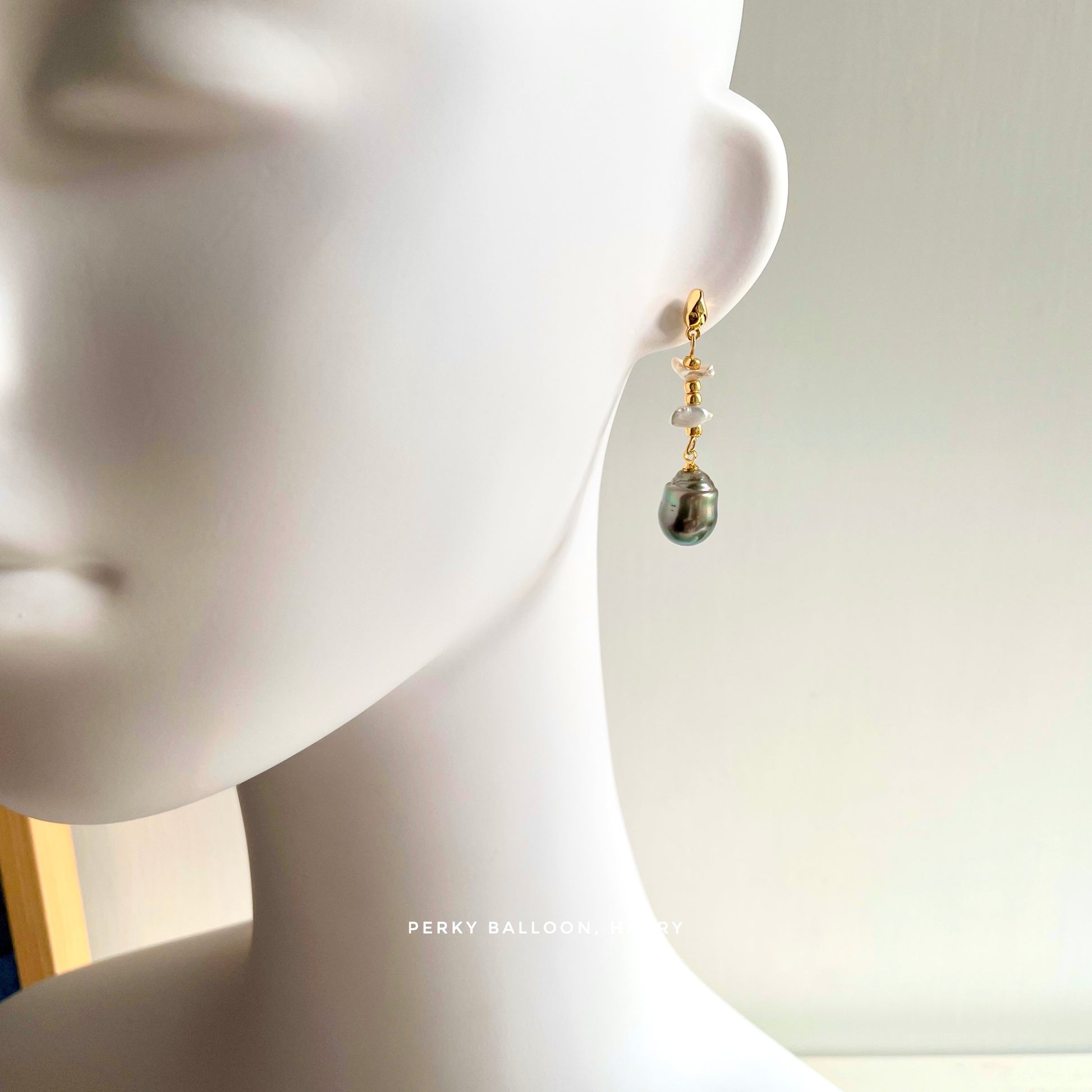 11×14 mm巴洛克大溪地珍珠,6-8mm巴洛克淡水珍珠,彩虹漸變色幻彩,黃銅鍍金耳釘,整體高約4.5 cm