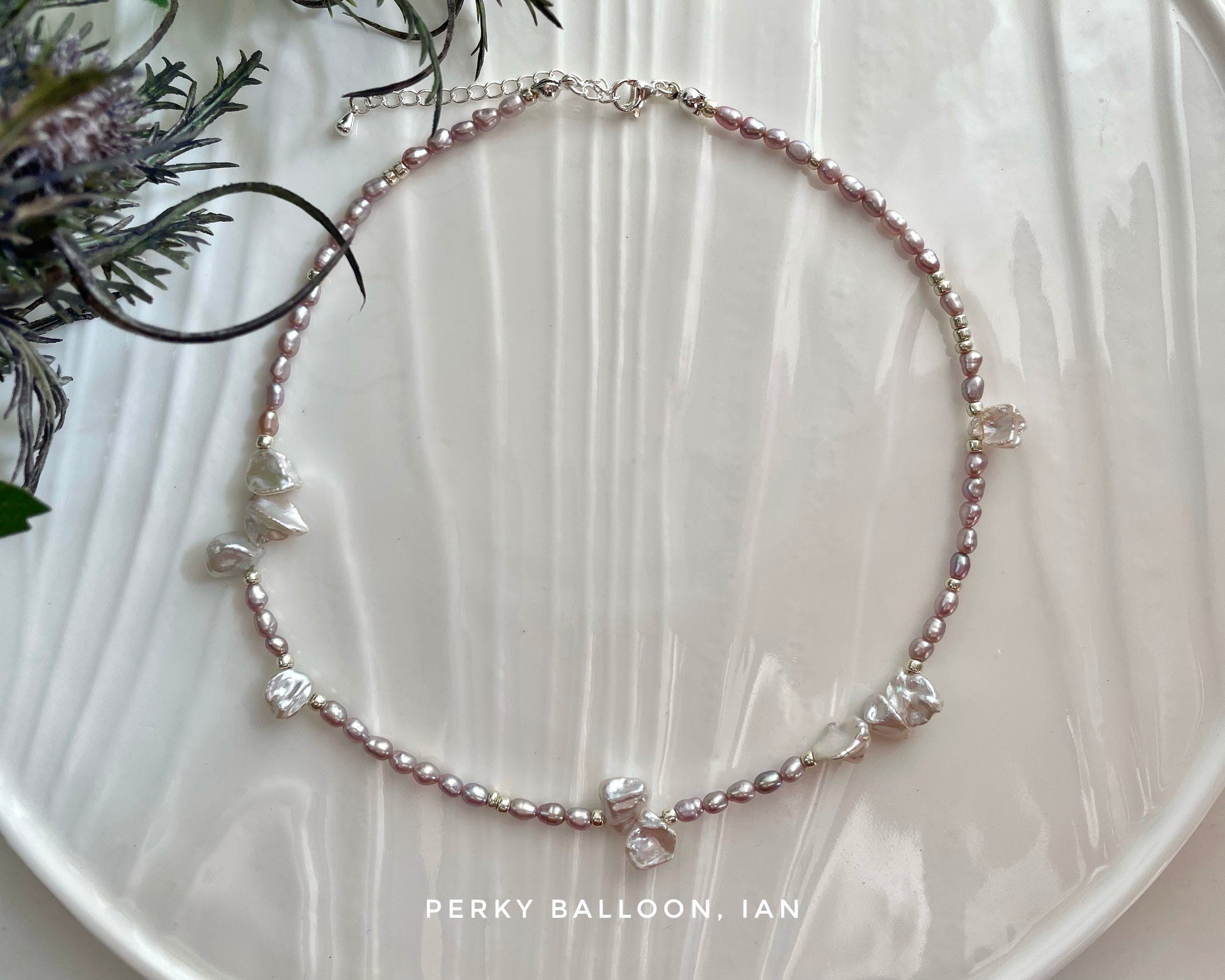 3-4 mm淡紫色米形+10 mm銀白色花瓣形淡水珍珠,輕輕的仙風😇,亦可以做全白/全紫色,頸鏈連扣長約38 +5 cm