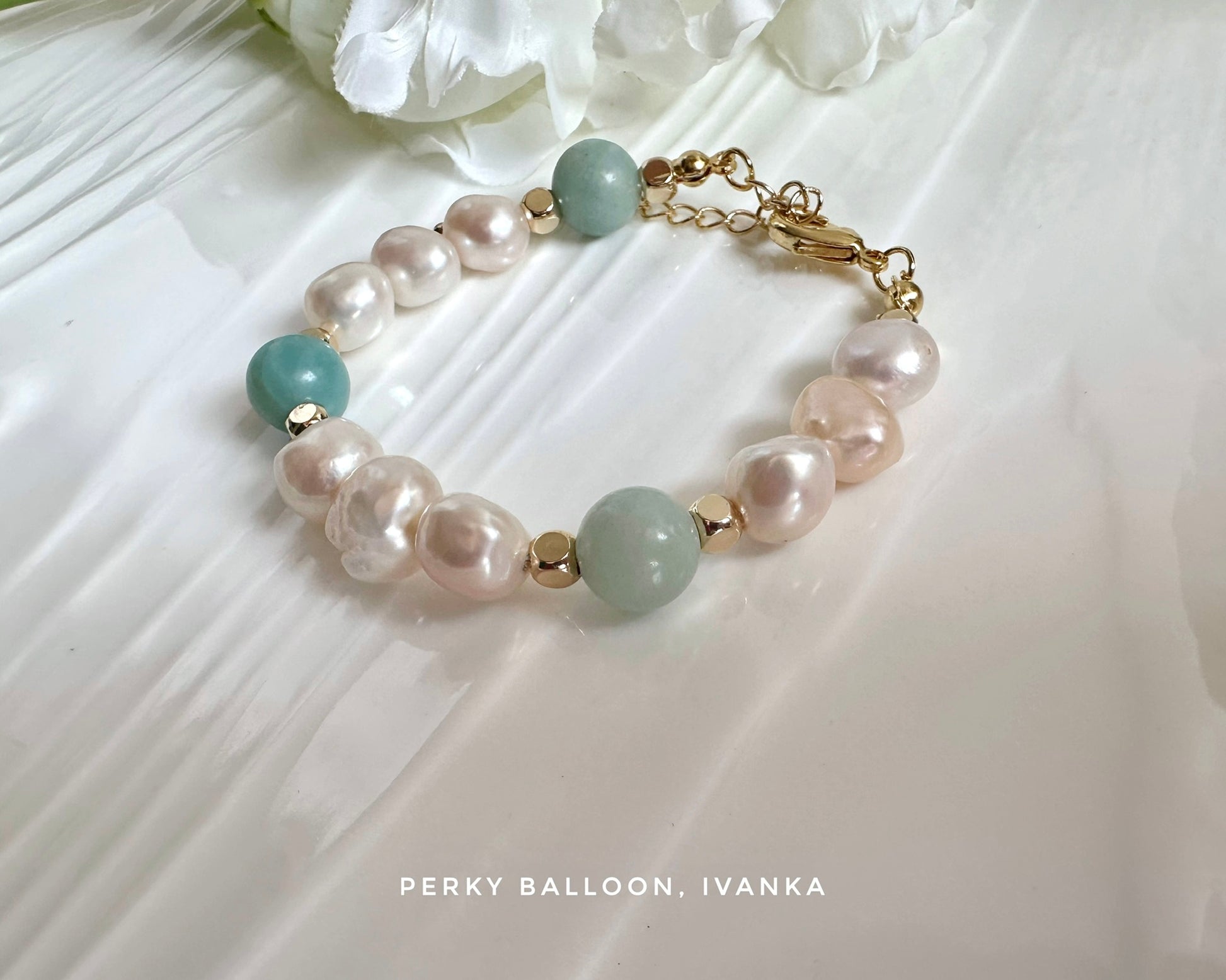 ~10mm巴洛克淡水珍珠,極淺粉紅色,天河石,手鏈長度大約15+5 cm