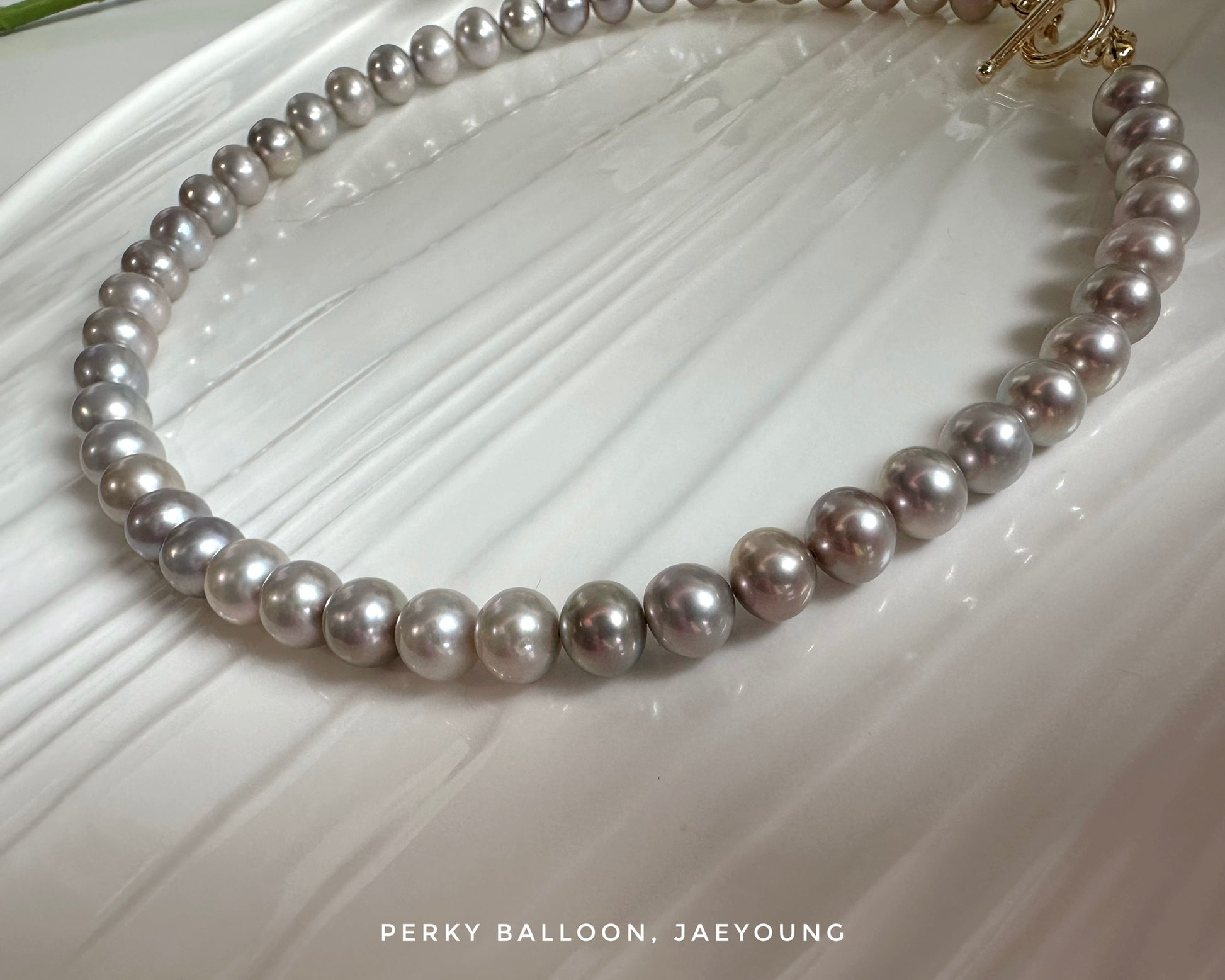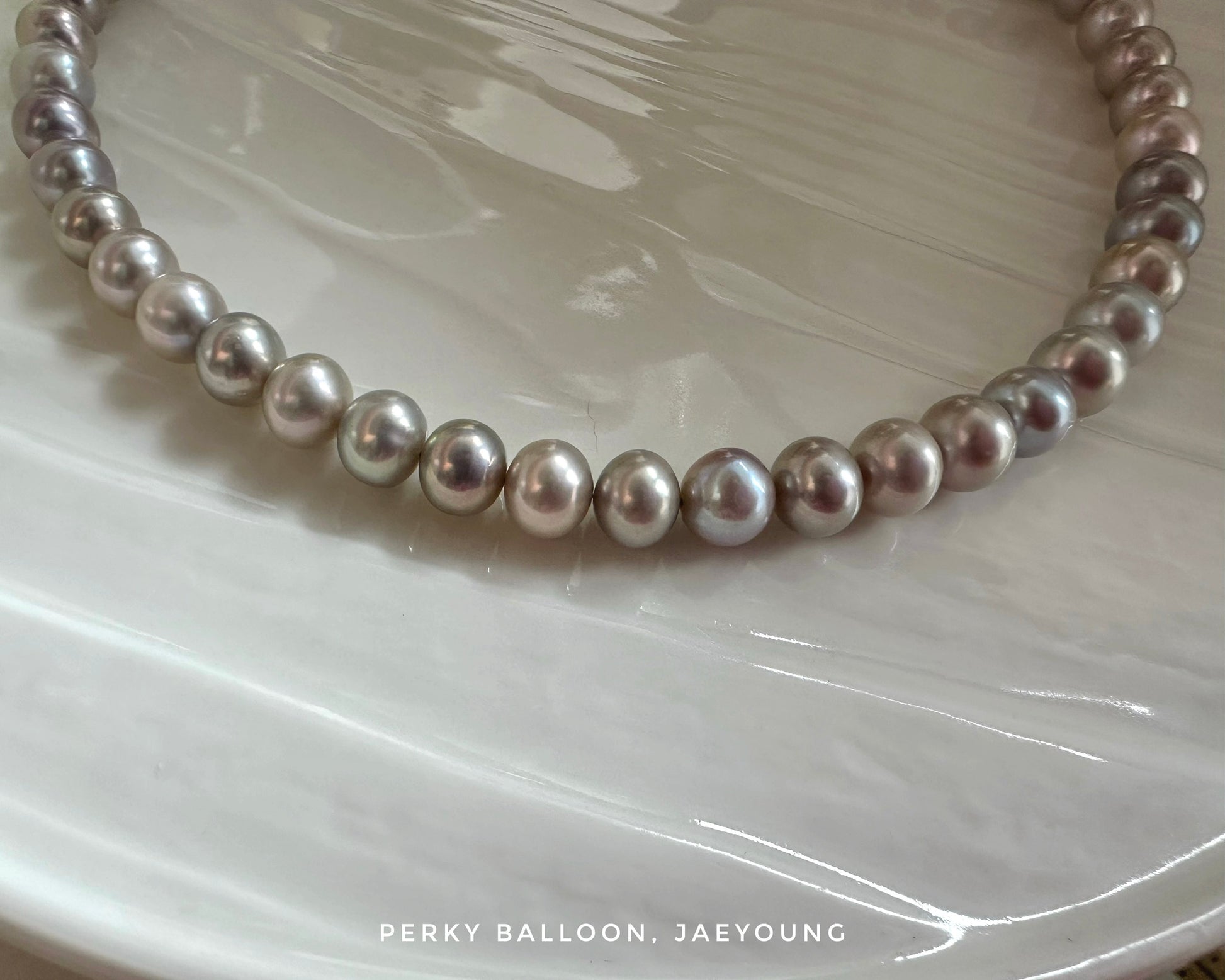 8.5-9.5mm 近圓形淡水珍珠,超強光,極微瑕,高級感紫灰smokey lilac幻彩色,有啲人叫佢做木槿色,可遇不可求嘅顏色,只有一條,頸鏈連扣長約40cm