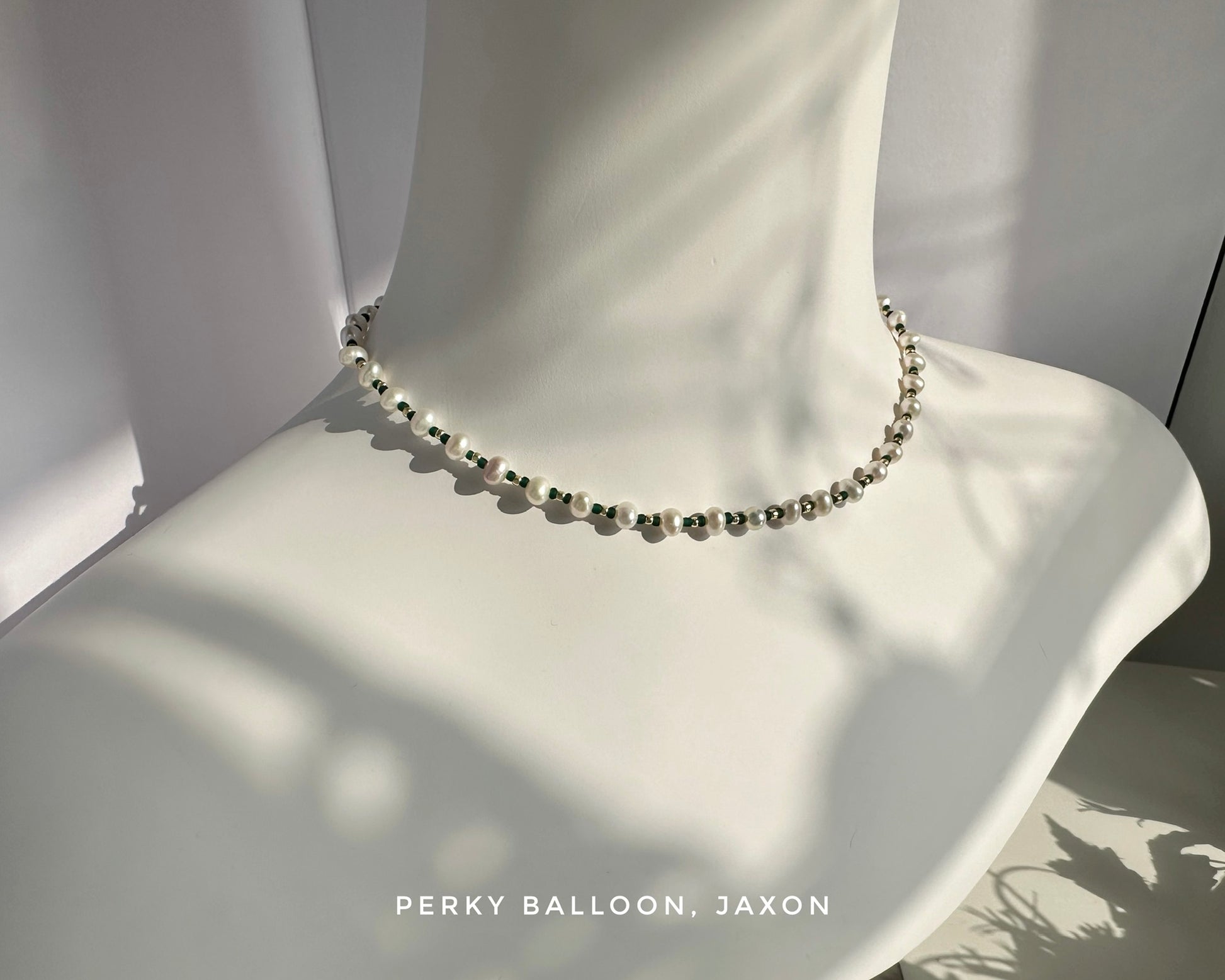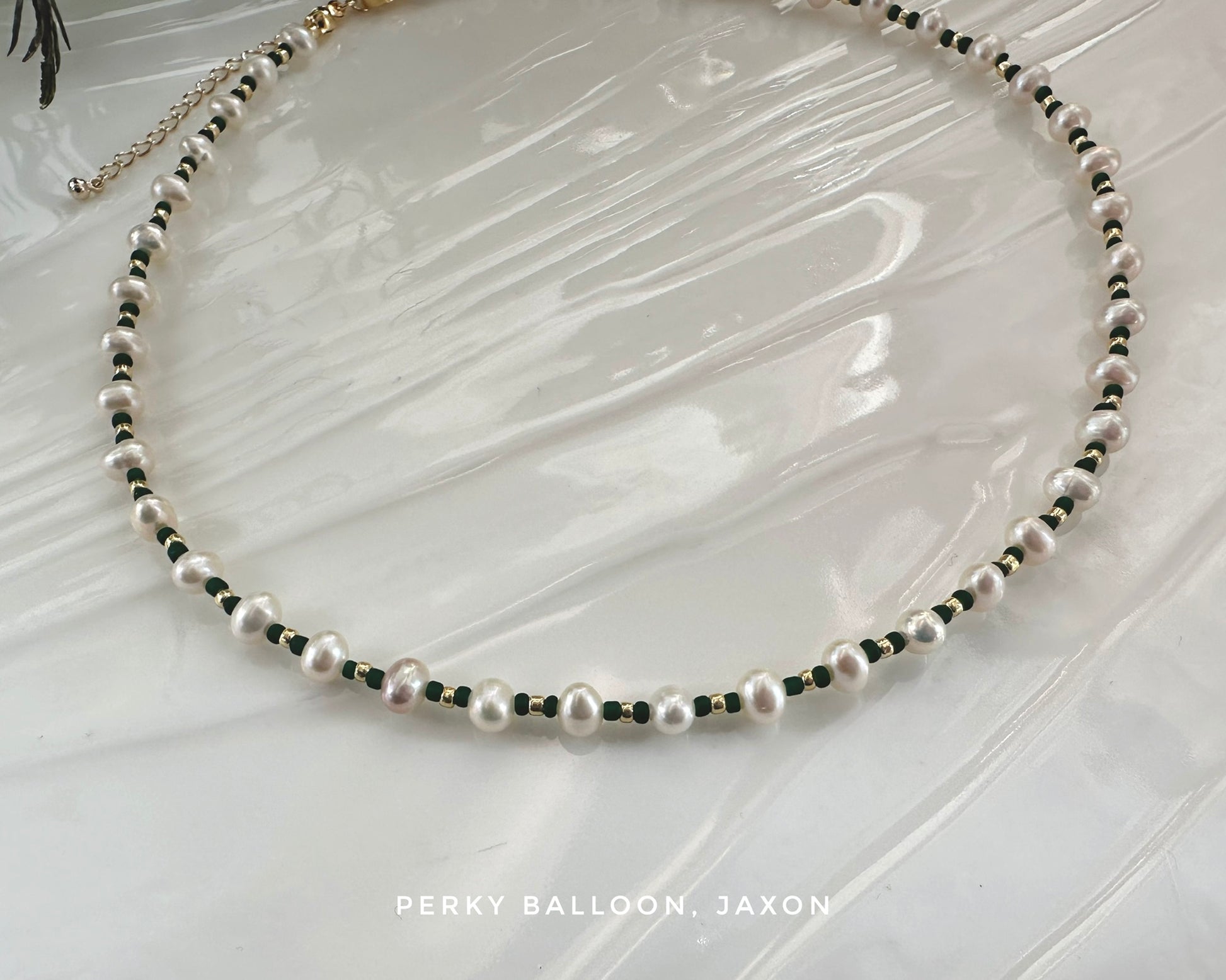 5mm橢圓形淡水珍珠,綠色金色玻璃珠仔,頸鏈連扣長度大約40+5 cm