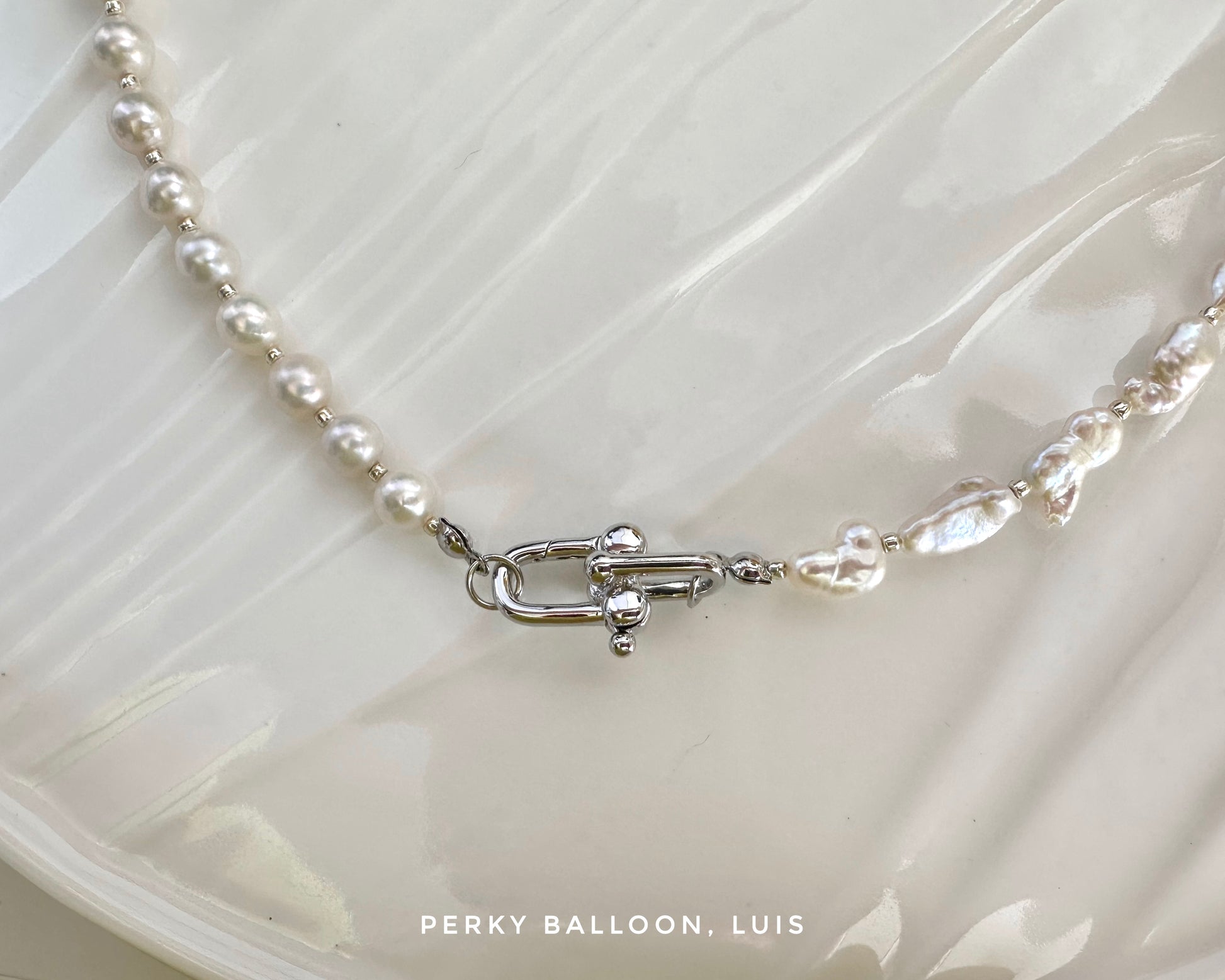 6-7mm 近圓形+巴洛克小石頭淡水珍珠,貪心half half 款,視乎心情睇吓擰邊面出嚟戴😝黃銅鍍金彈弓馬蹄扣,頸鏈連扣長約40 cm,珍珠可選白色/粉橙色,扣可選金色/銀色