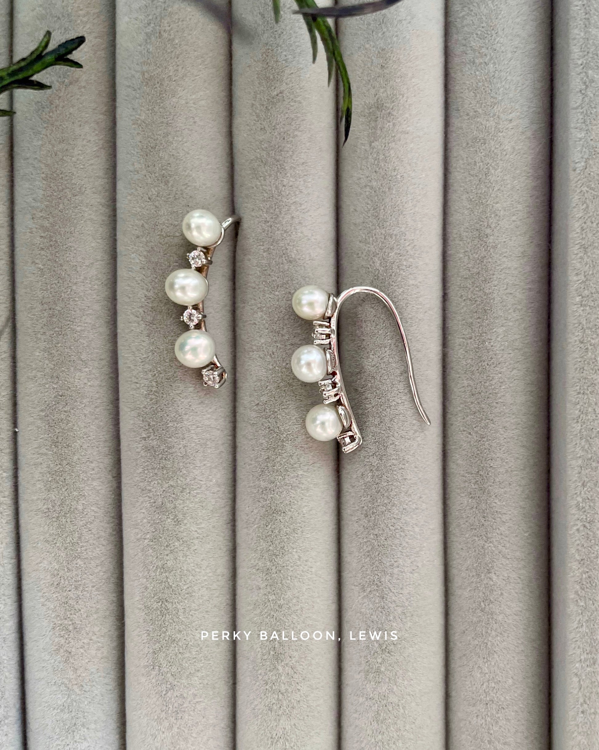 4-5mm近圓形淡水珍珠,925純銀鑲鋯石優雅流線形耳勾,亦都可以戴喺耳骨位做ear climber,長度大約2.5cm