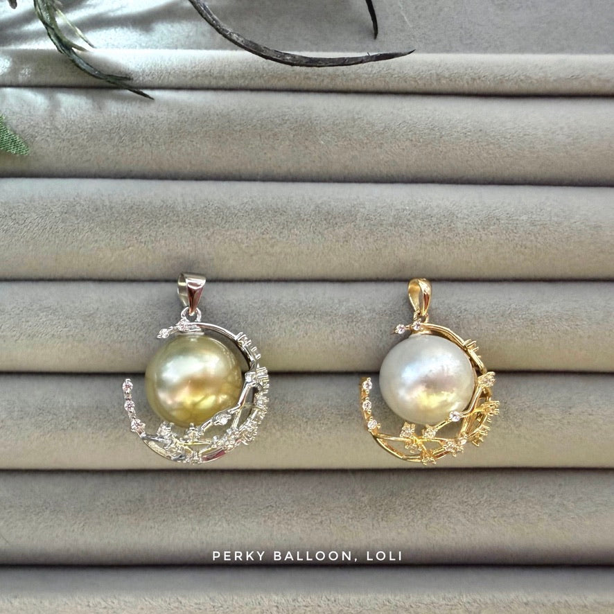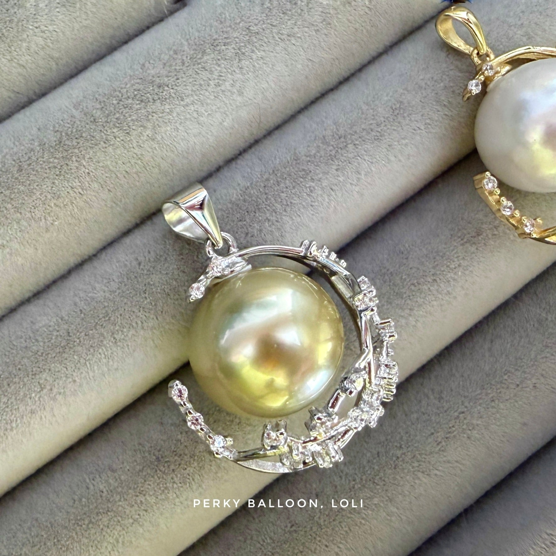 右邊配12.2 mm近正圓澳白珍珠,銀白色,珍珠表面有雪花一般嘅hammerwork生長紋,非常特別嘅一粒