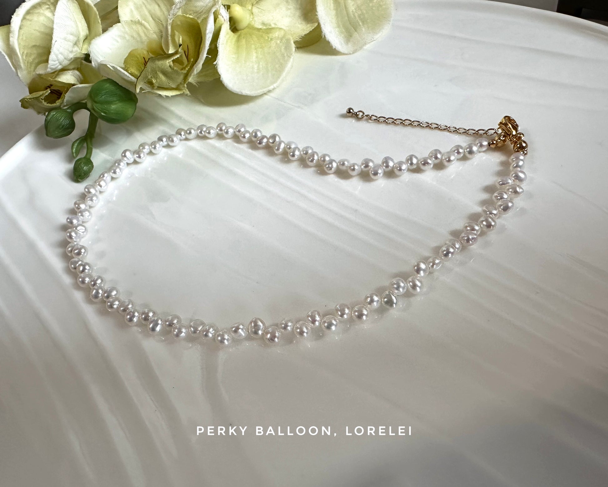 3-4mm迷你巴洛克淡水珍珠,表皮非常光滑,超強光,上身效果好閃,佢打孔嘅位置係類似花瓣珍珠靠邊打,所以穿起上嚟會有蕾絲交錯嘅效果,非常靚,平時咁高質量嘅珍珠好少會咁樣打孔,因為穿一條鏈需要用多好多珍珠啊🤭🤭頸鏈連扣長度大約38+5 cm