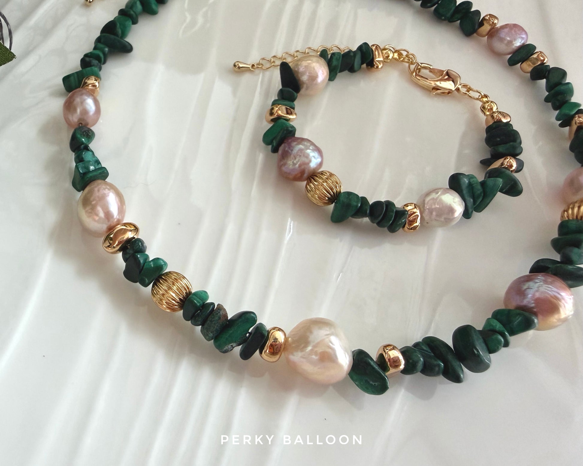 10-12mm巴洛克淡水珍珠+孔雀石,頸鏈連扣長度大約40+5cm