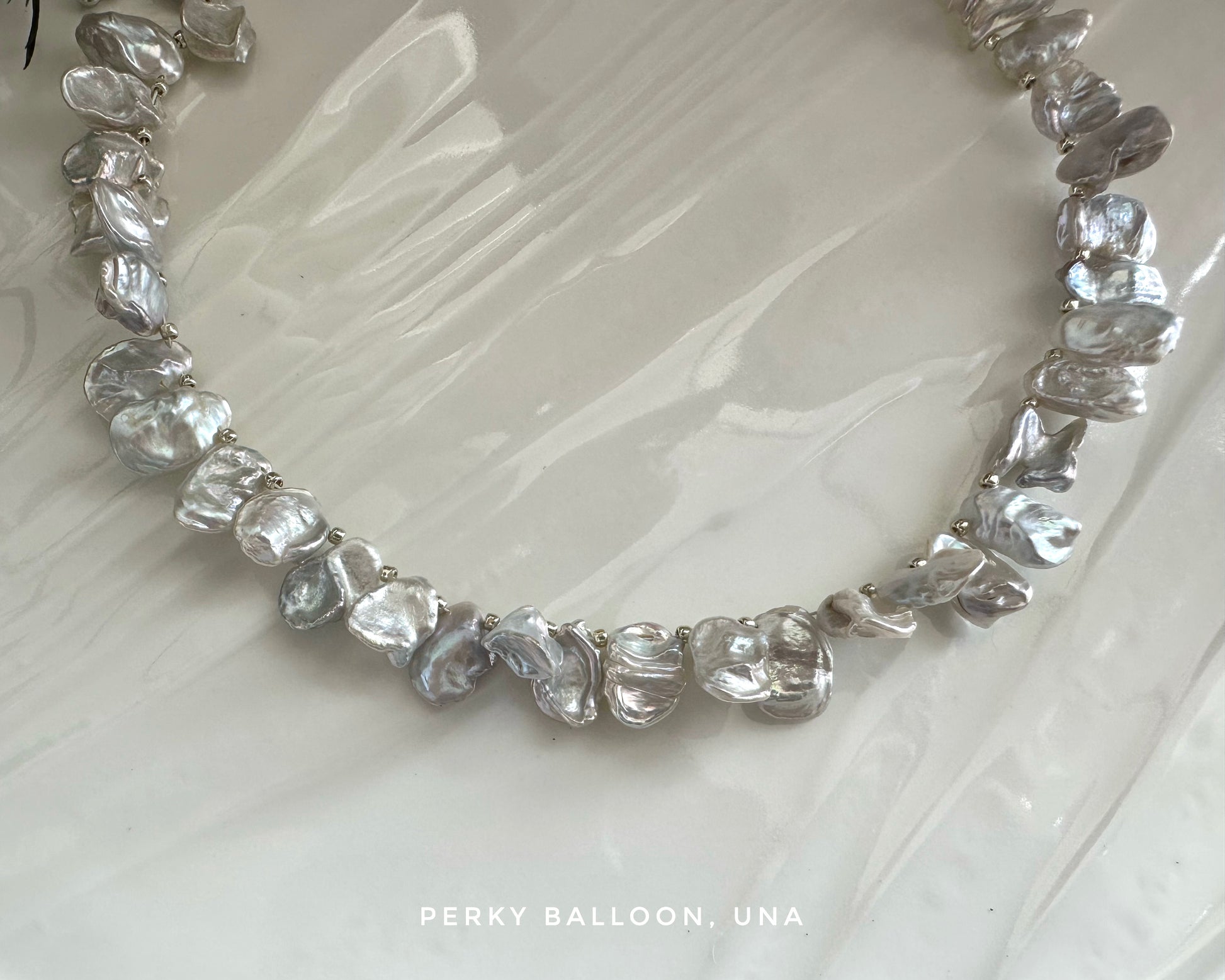 8-10mm 巴洛克花瓣形淡水珍珠,天然銀藍色帶幻彩,極罕有色,戴上身好似個潾光閃爍嘅Elizabethan collar,超仙,頸鏈連扣長約38+5 cm ,very limited stock