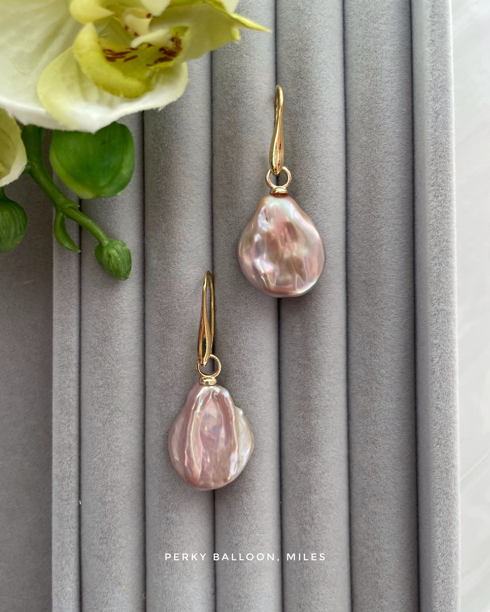 17×22 mm巨大扁珍珠,天然幻彩紫色,黃銅鍍金耳勾,整體長度大約4.5 cm