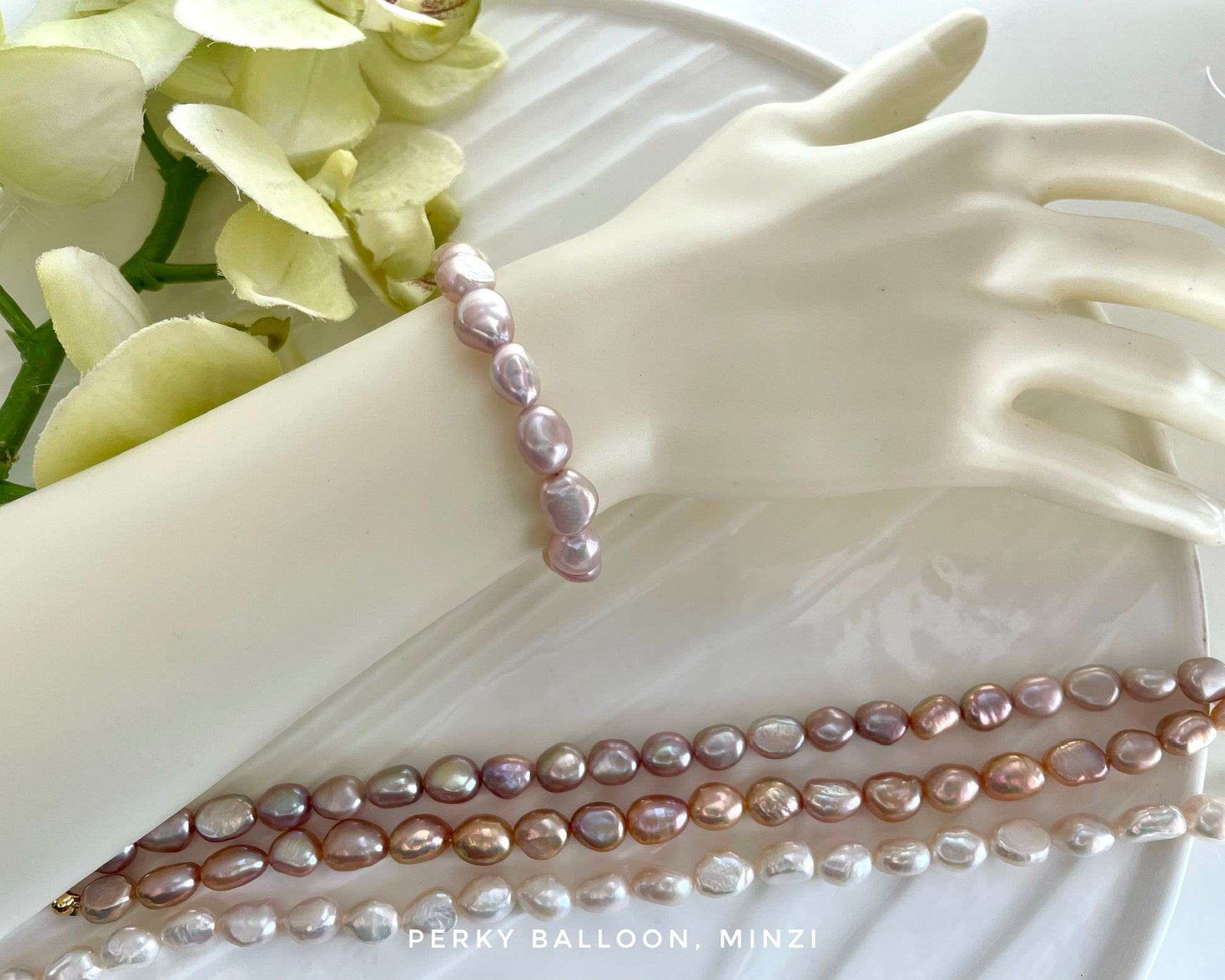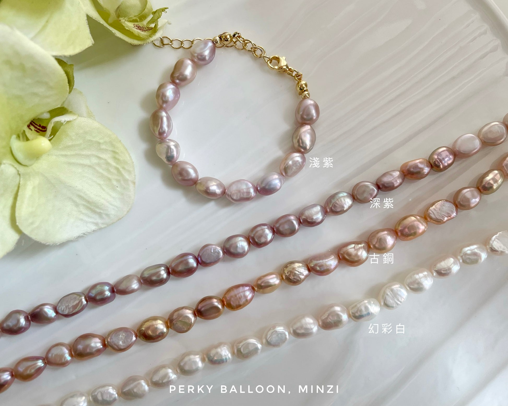 7-8mm巴洛克淡水珍珠,超強光,尺寸唔誇張,優雅易襯款,珍珠可以揀淺紫/深紫/古銅/幻彩白,手鏈連扣大約15+5 cm