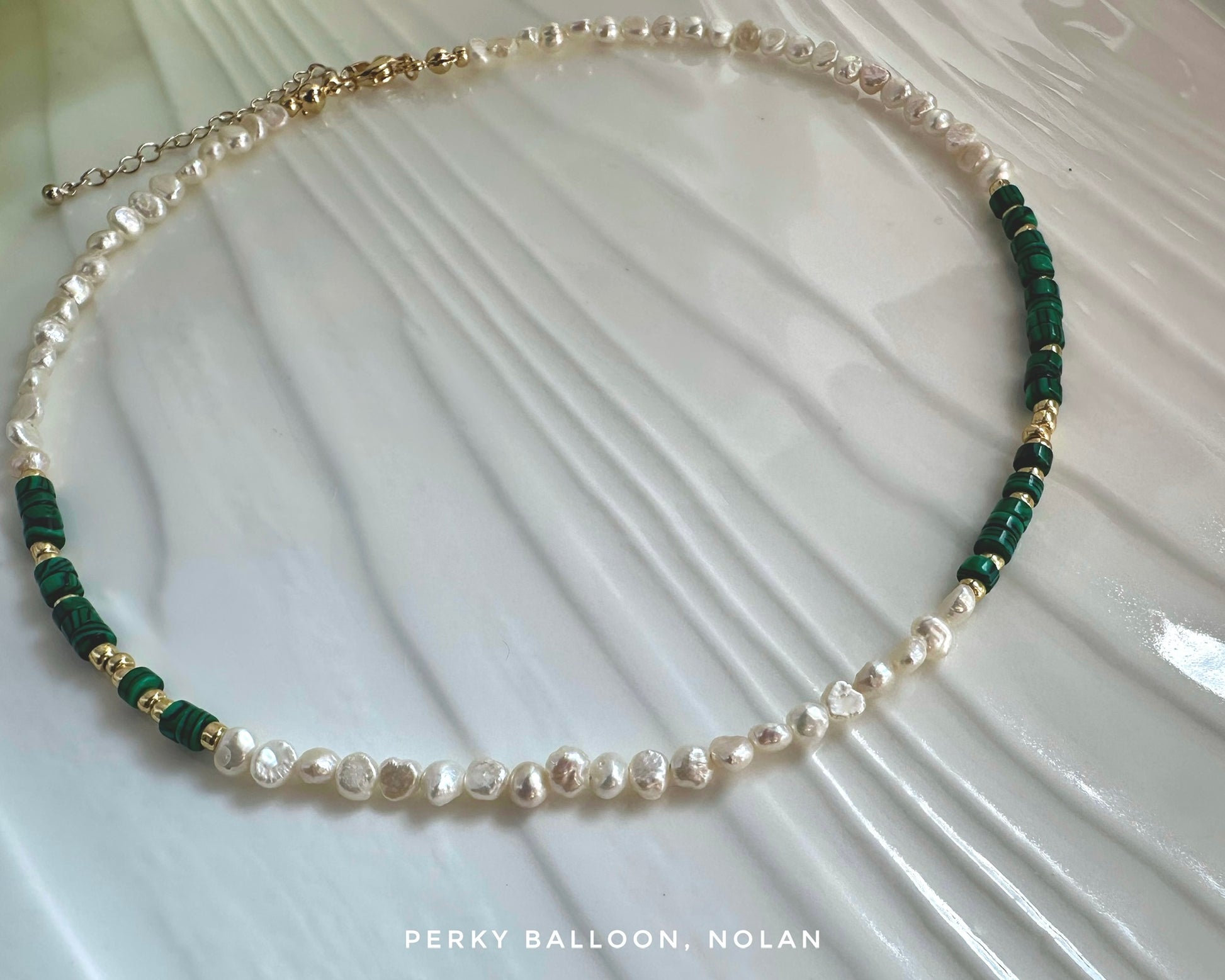 4-5mm 巴洛克淡水珍珠+孔雀石,頸鏈連扣長約40+ 5 cm
