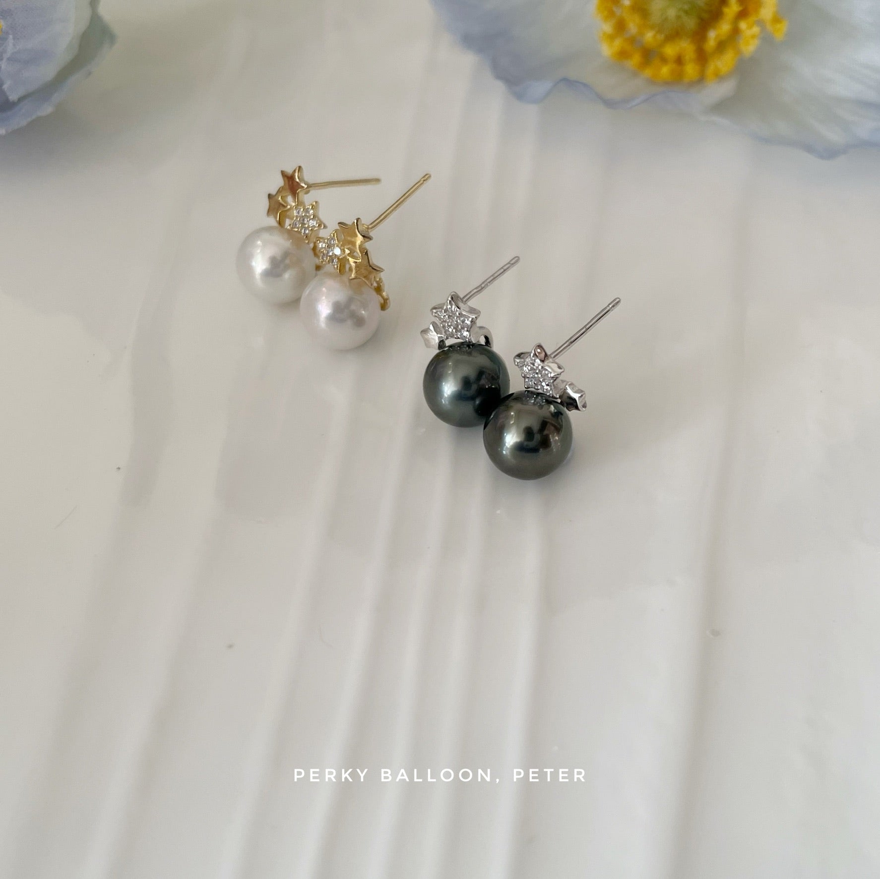 8-8.5mm 近圓形淡水珍珠,925純銀/純銀鍍金鑲鋯石星星耳釘,整體高度約1.2cm