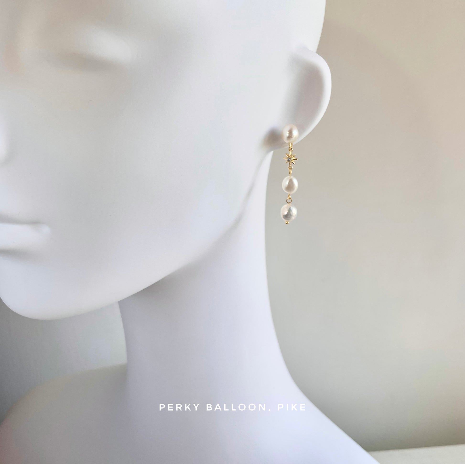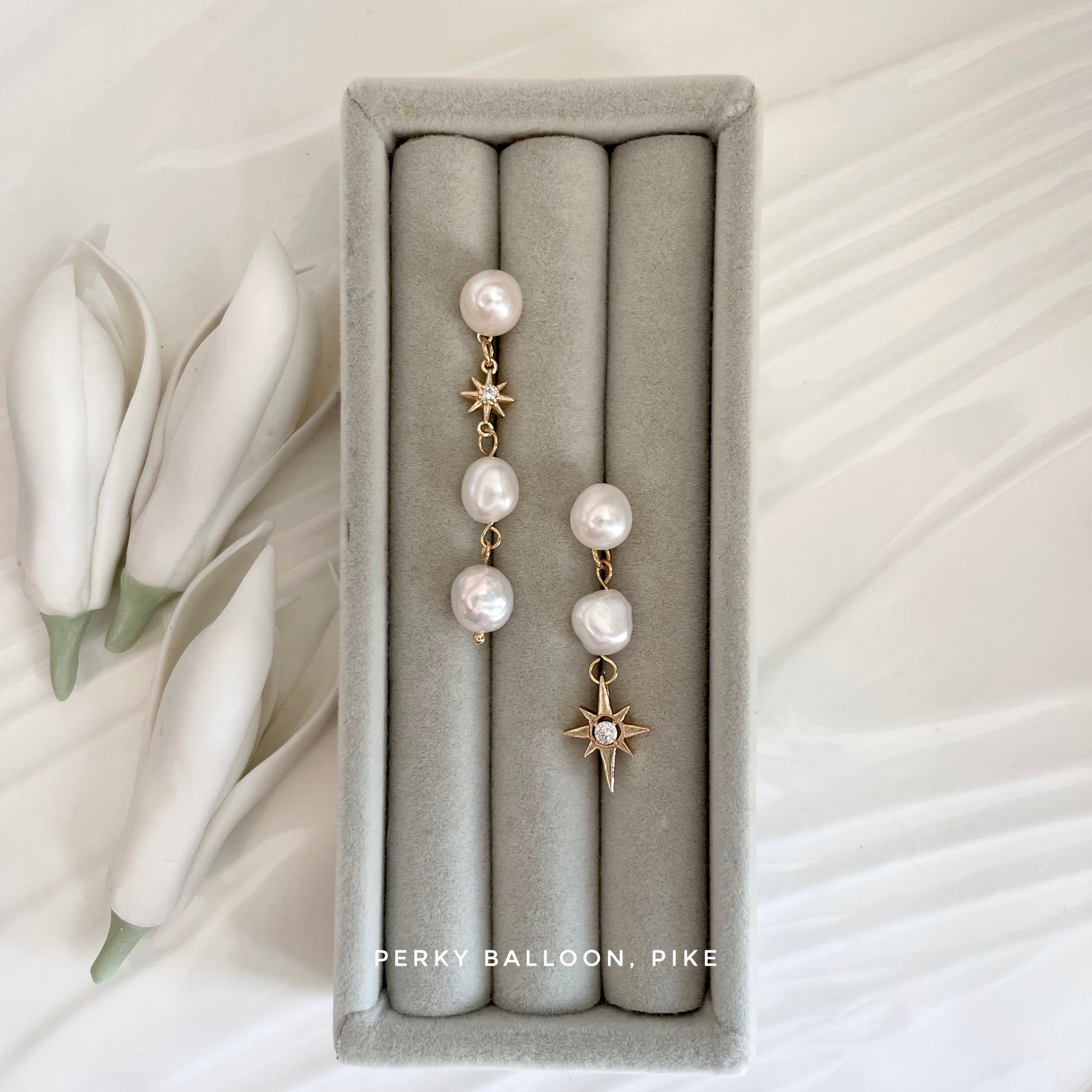 7-8mm巴洛克淡水珍珠,黃銅鍍金鴛鴦款星星耳環,耳針部份係925銀鍍金,兩邊長度大約為3.5cm /4.5cm