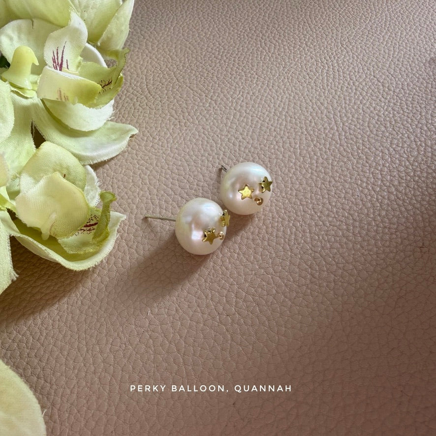~13 mm扁圓形淡水珍珠,黃銅鍍金星星裝飾,配925純銀耳釘/黃銅鍍金耳夾(默認銀色)