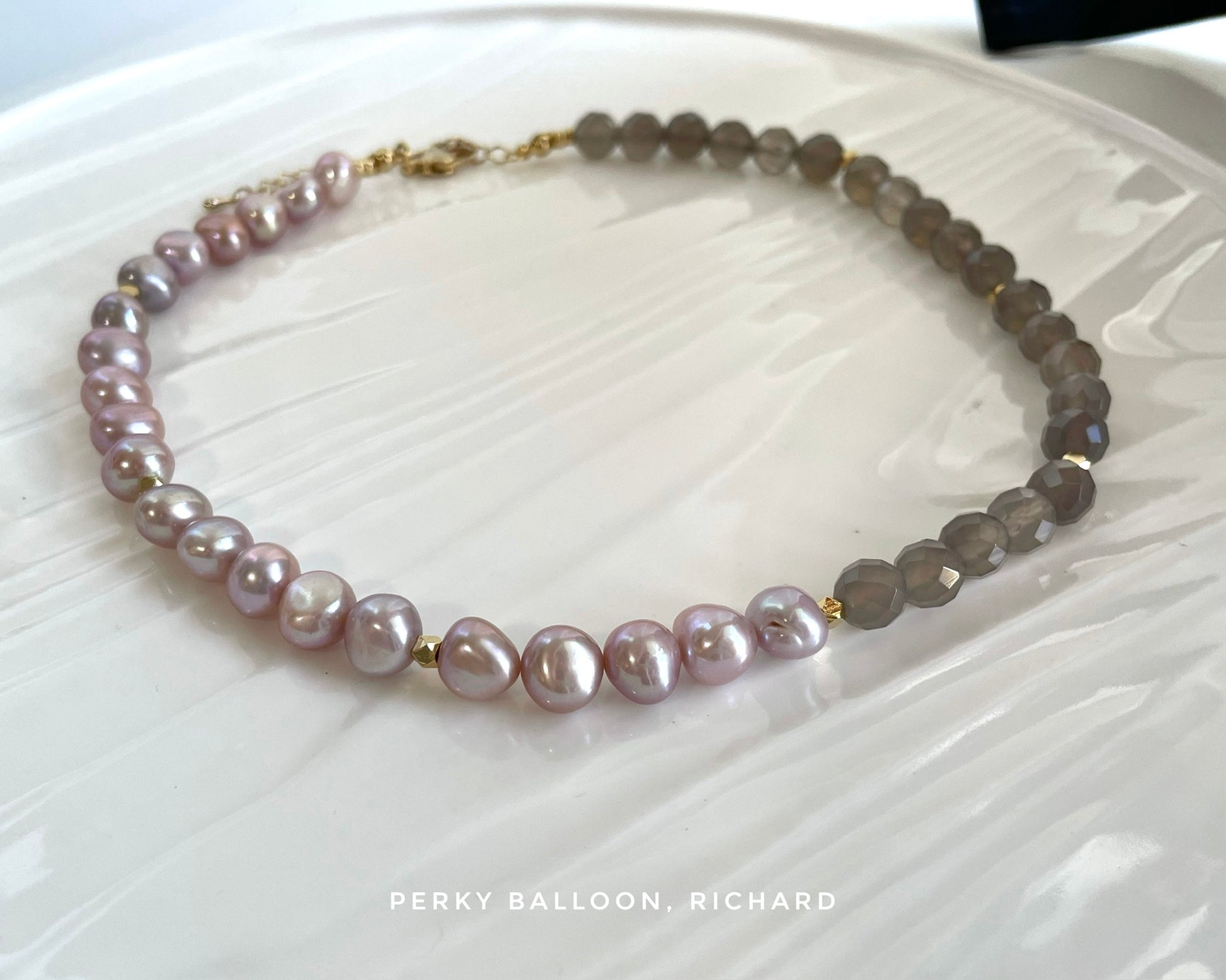 9-10 mm巴洛克淡水珍珠,紫色帶幻彩光,形狀飽滿 ,8-9mm切面灰水晶,頸鏈連扣長大約40+5 cm