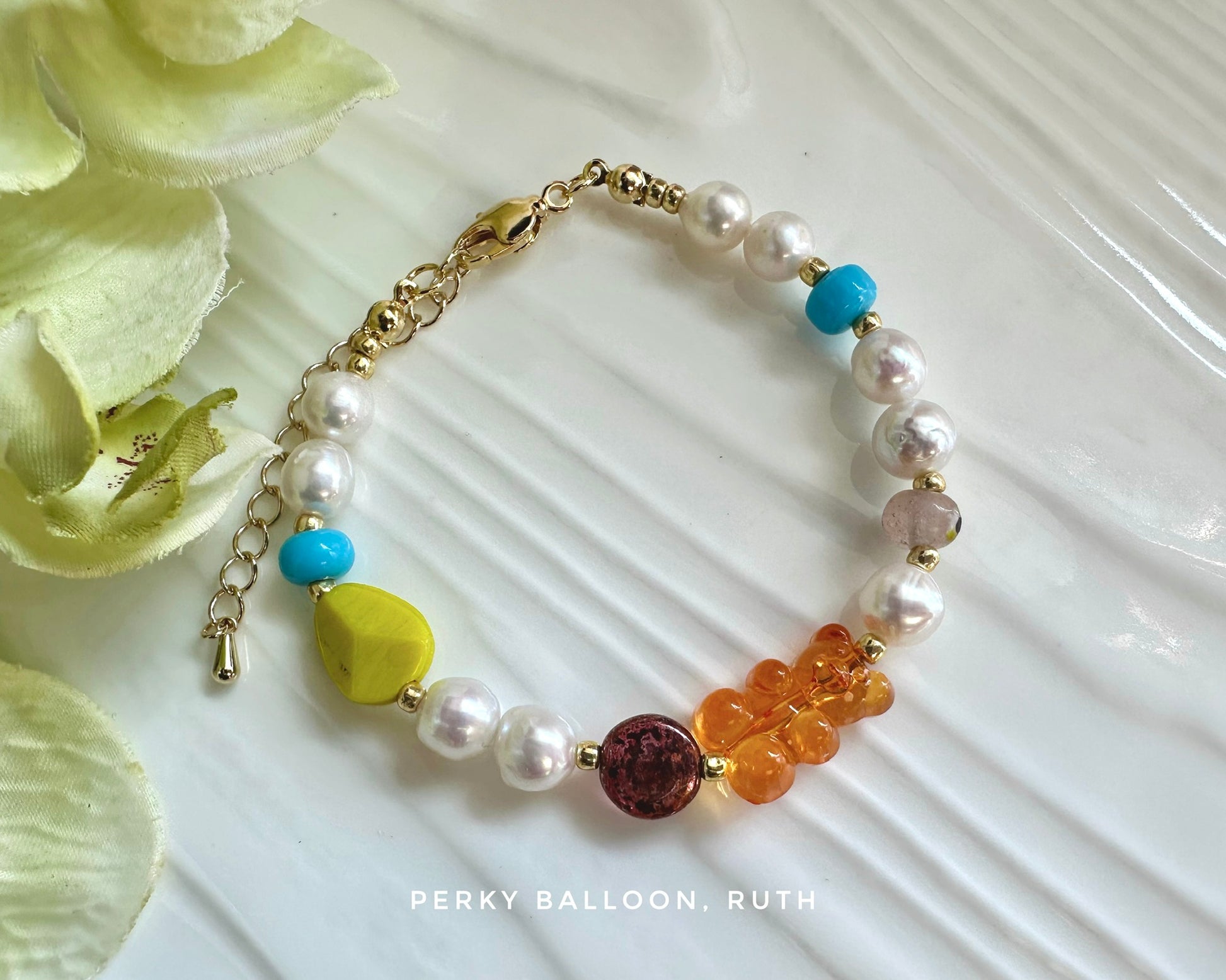 7-8mm巴洛克淡水珍珠+手工玻璃+亞加力Gummy bear,手鏈連扣長約16+5 cm