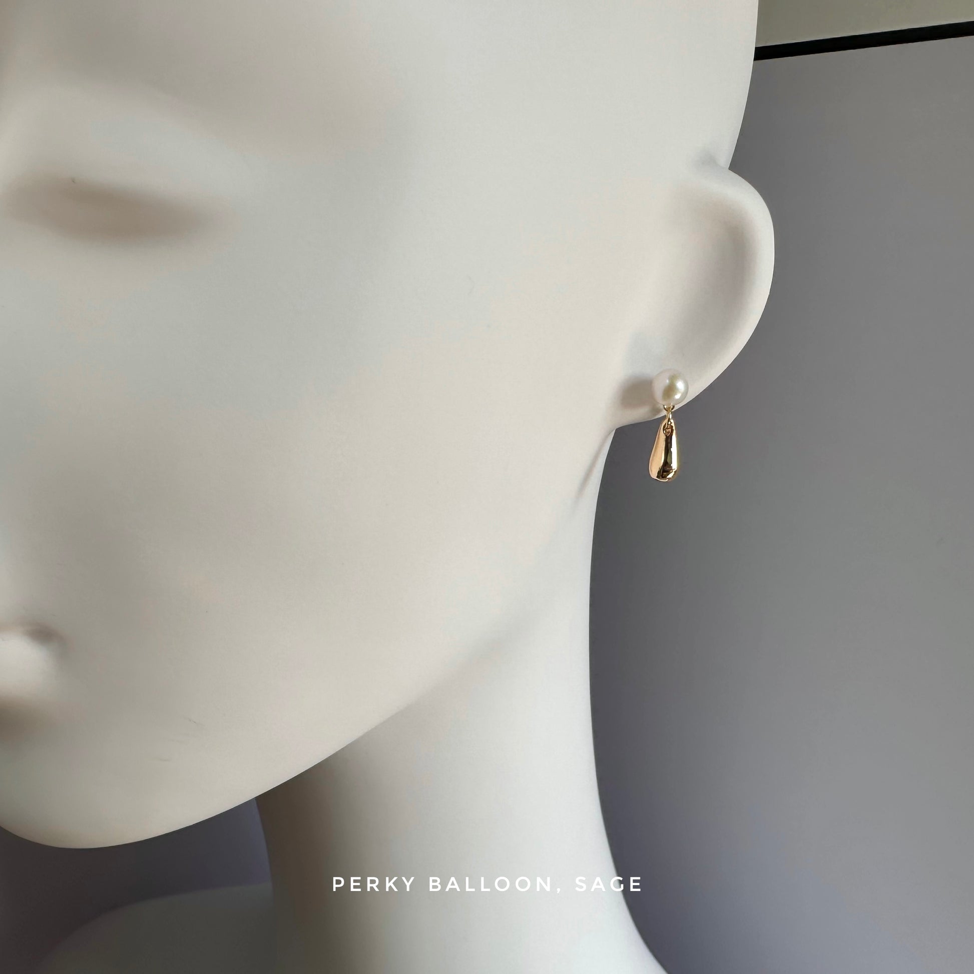 ~6mm近圓形淡水珍珠,黃銅鍍金耳釘 / 黃銅鍍金螺絲耳夾,耳針部份係925銀鍍金,下面水滴可以搖擺可以轉銀色,整體長度大約1.8 cm