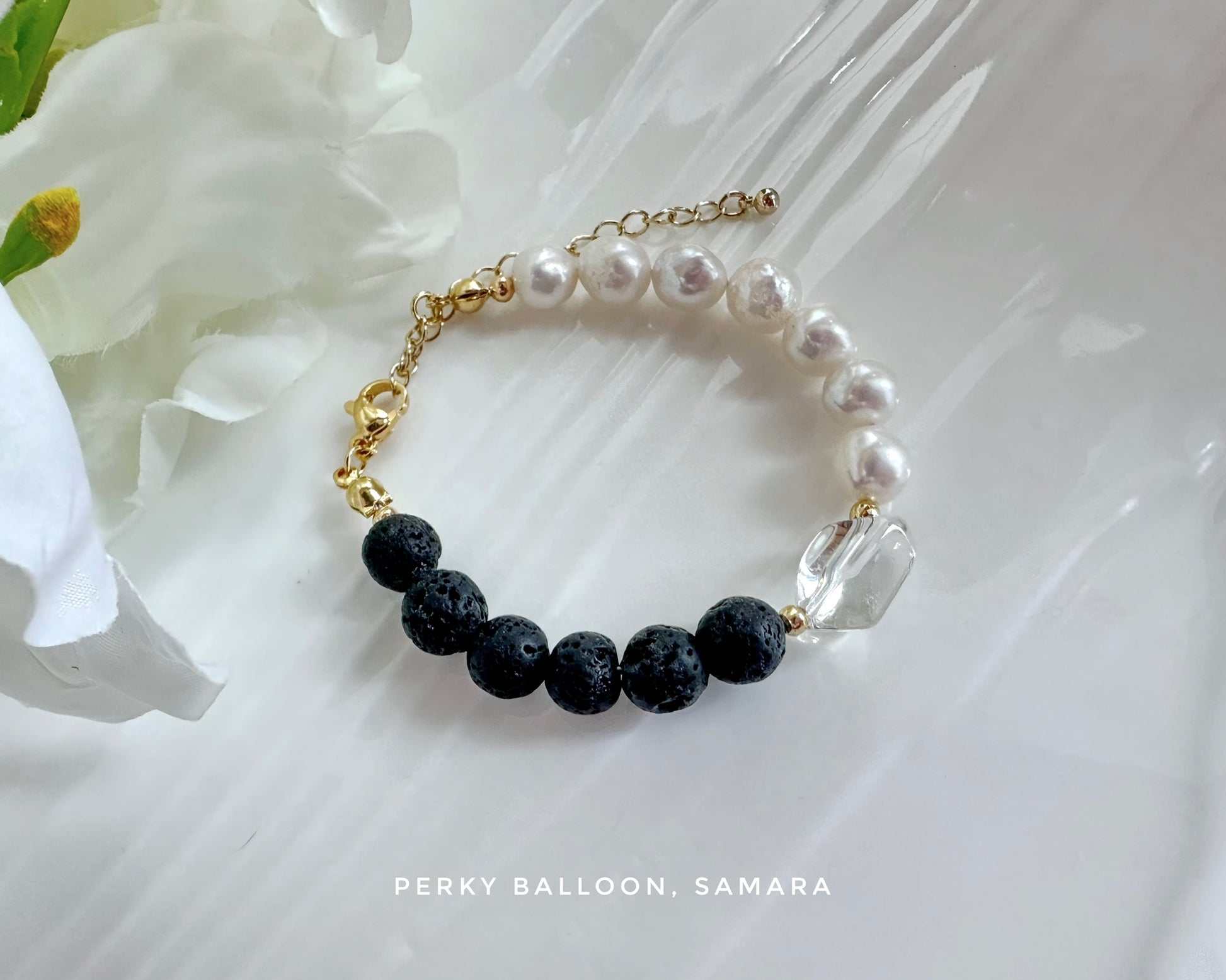 7-8mm巴洛克淡水珍珠+火山石+白水晶,黑白加透明嘅組合,手鏈連扣長度大約15+5 cm