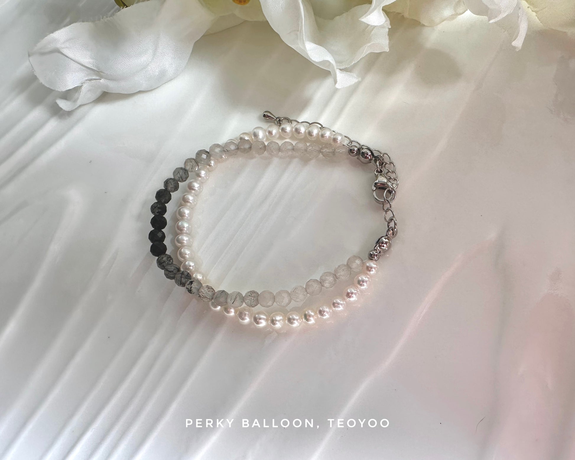 4mm近圓形淡水珍珠,白色超強光,漸變色排列黑髮晶,水墨畫氣質嘅雙層手鏈,連扣長度大約15+5 cm