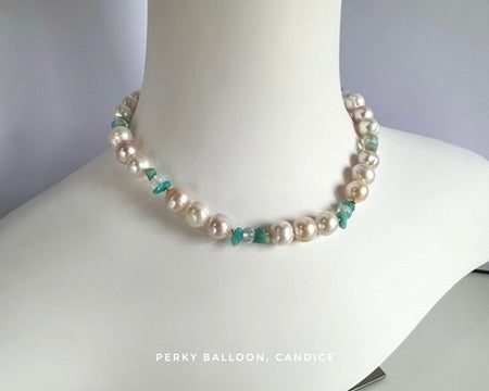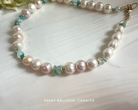 11-13mm巨大圈紋淡水珍珠+天河石+蛋白石,豪華強光,頸鏈連扣長度大約45cm