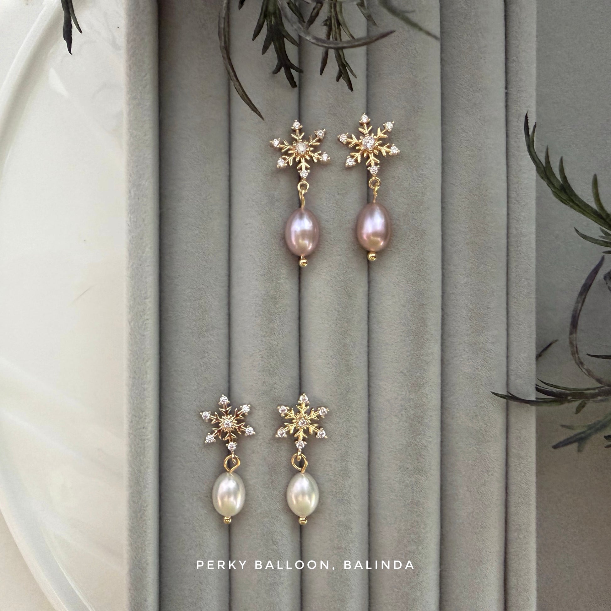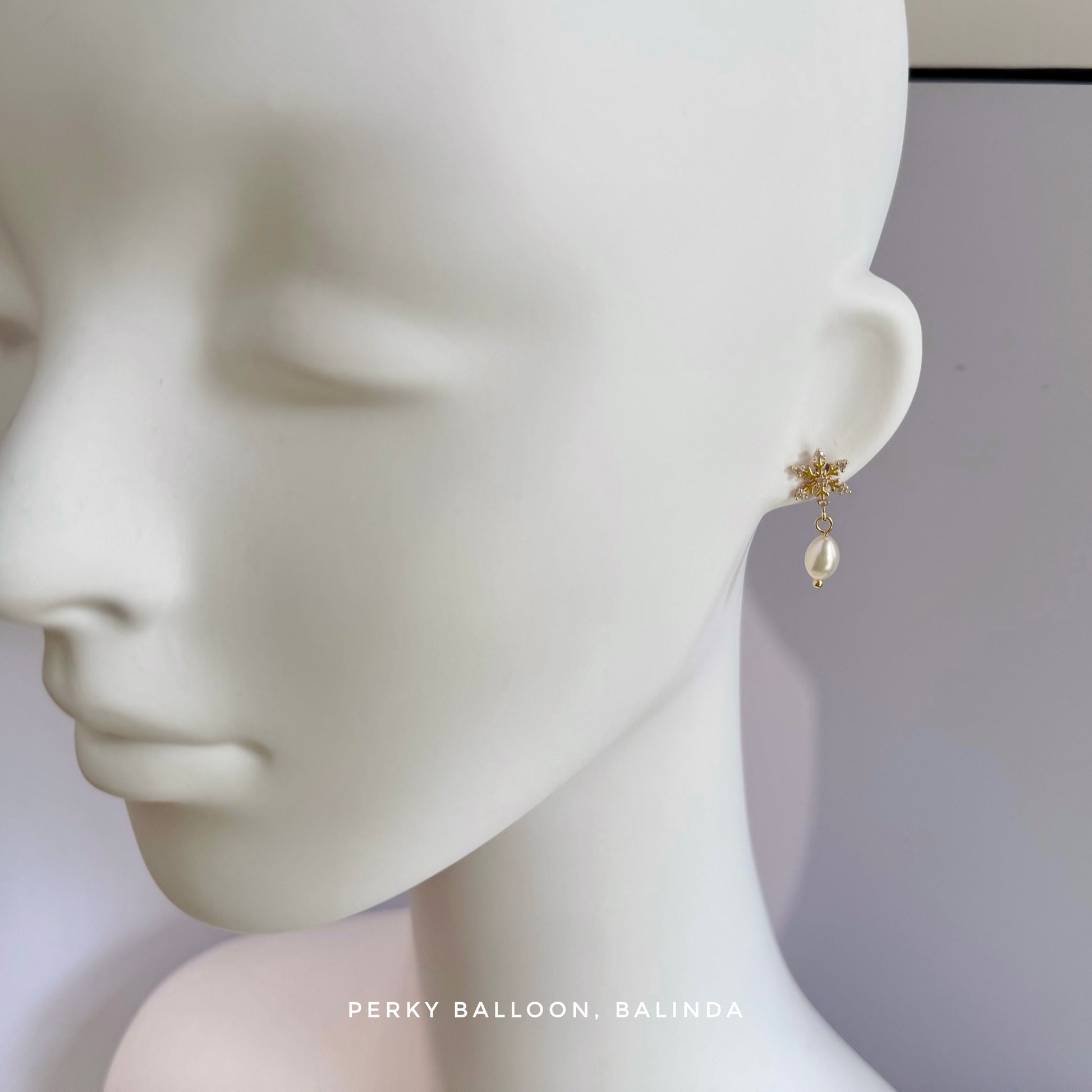 6-7mm水滴形淡水珍珠,黃銅鍍金鑲鋯石雪花耳釘,耳針部份係925銀鍍金,珍珠可以揀白色/橙色/紫色,上圖sample 白色/紫色,整體高度大約2.5 cm