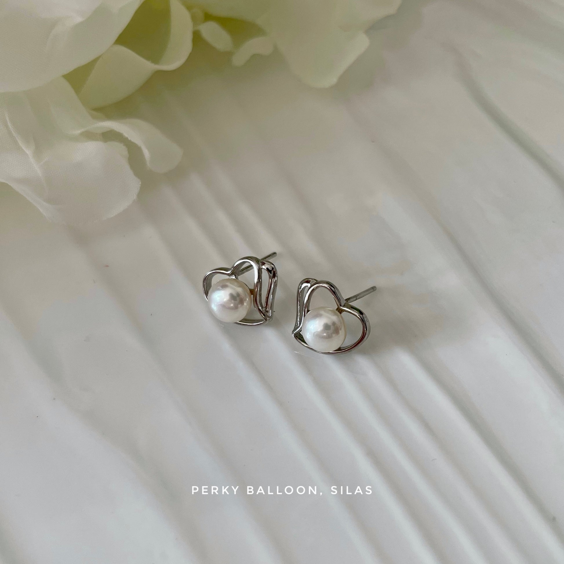 6mm 扁圓淡水珍珠,白色超強光,925純銀心心耳釘,寛大約1.2 cm