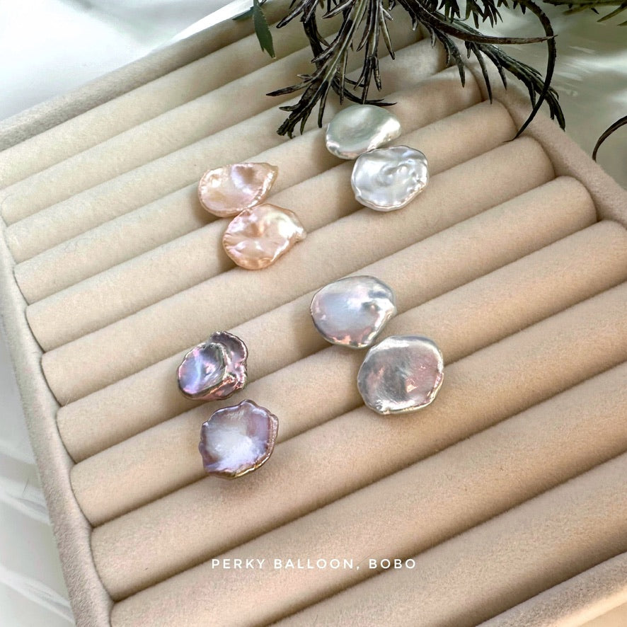 花瓣形淡水珍珠,寬度大約14mm,天然幻彩光,有白色/橙色/淡紫/深紫,配925純銀耳釘/黃銅鍍金螺絲耳夾(默認銀色)