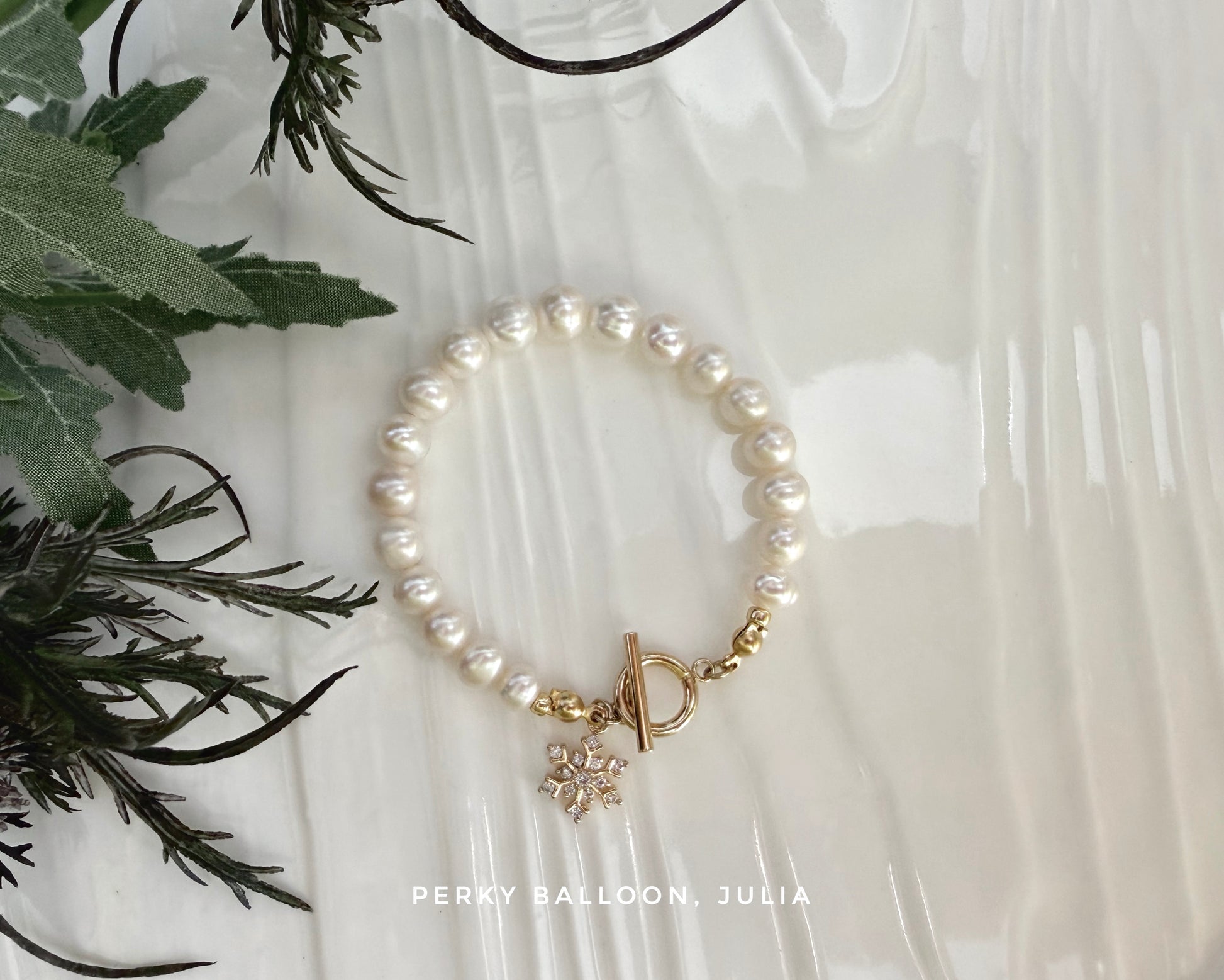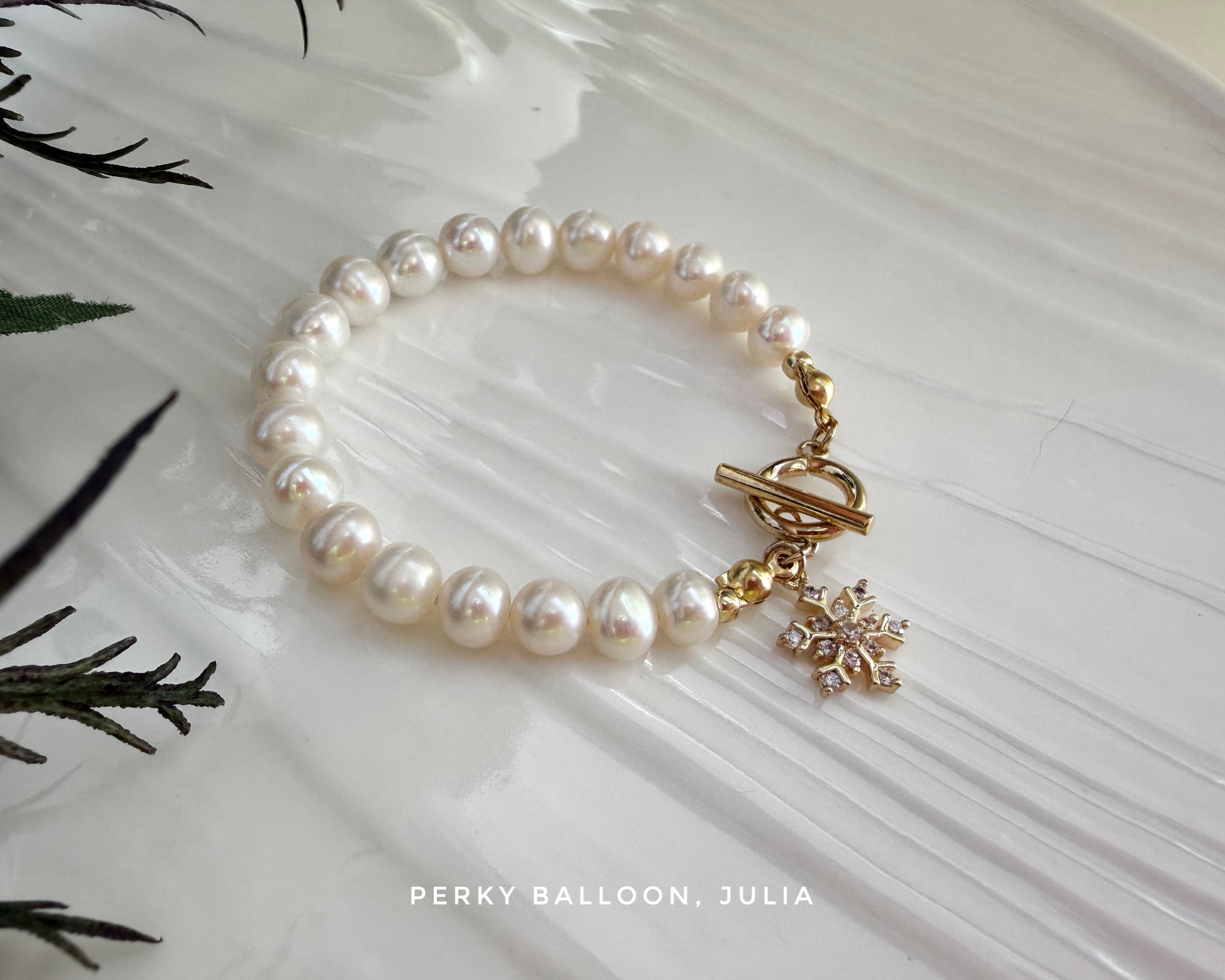 7-8mm近圓形淡水珍珠,尾部帶閃閃嘅雪花charm,啱晒聖誕嘅氣氛,手鏈連扣長約16 cm,需要調節長度嘅客人亦可以訂做龍蝦扣+5 cm延長鏈