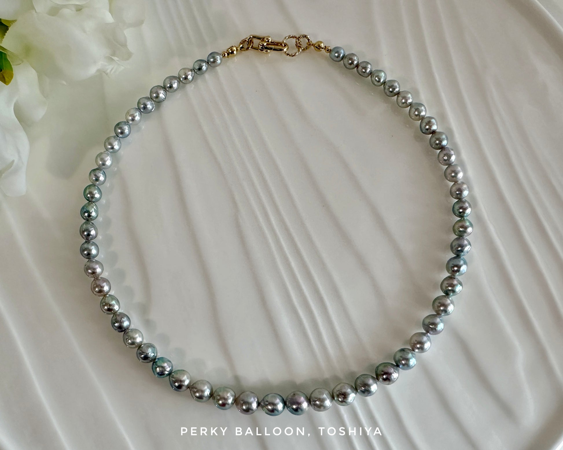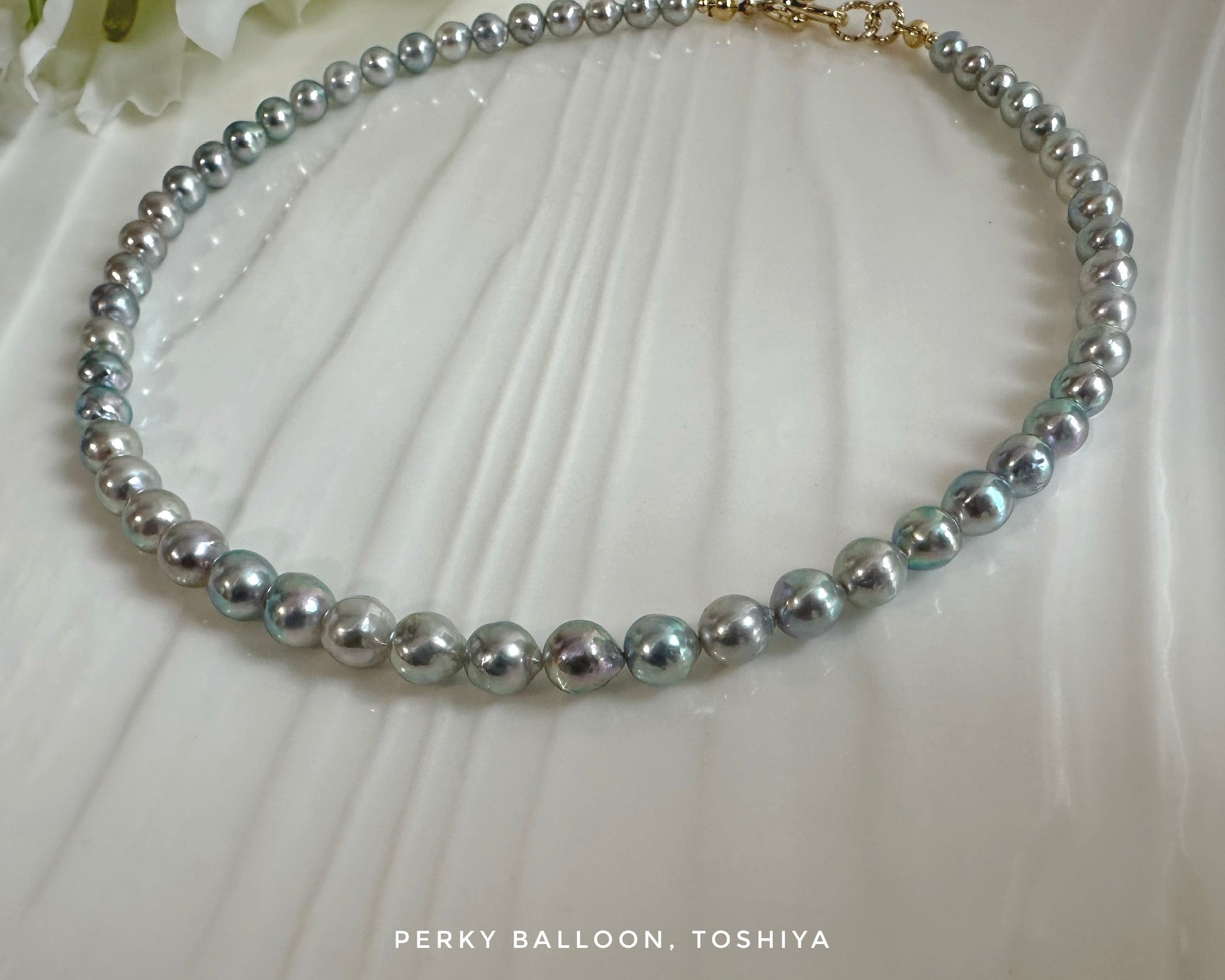5-8mm近圓形巴洛克日本Akoya,天然灰藍色,超勁幻彩,珠層好潤,光澤超勁,頸鏈連扣長度大約40 cm