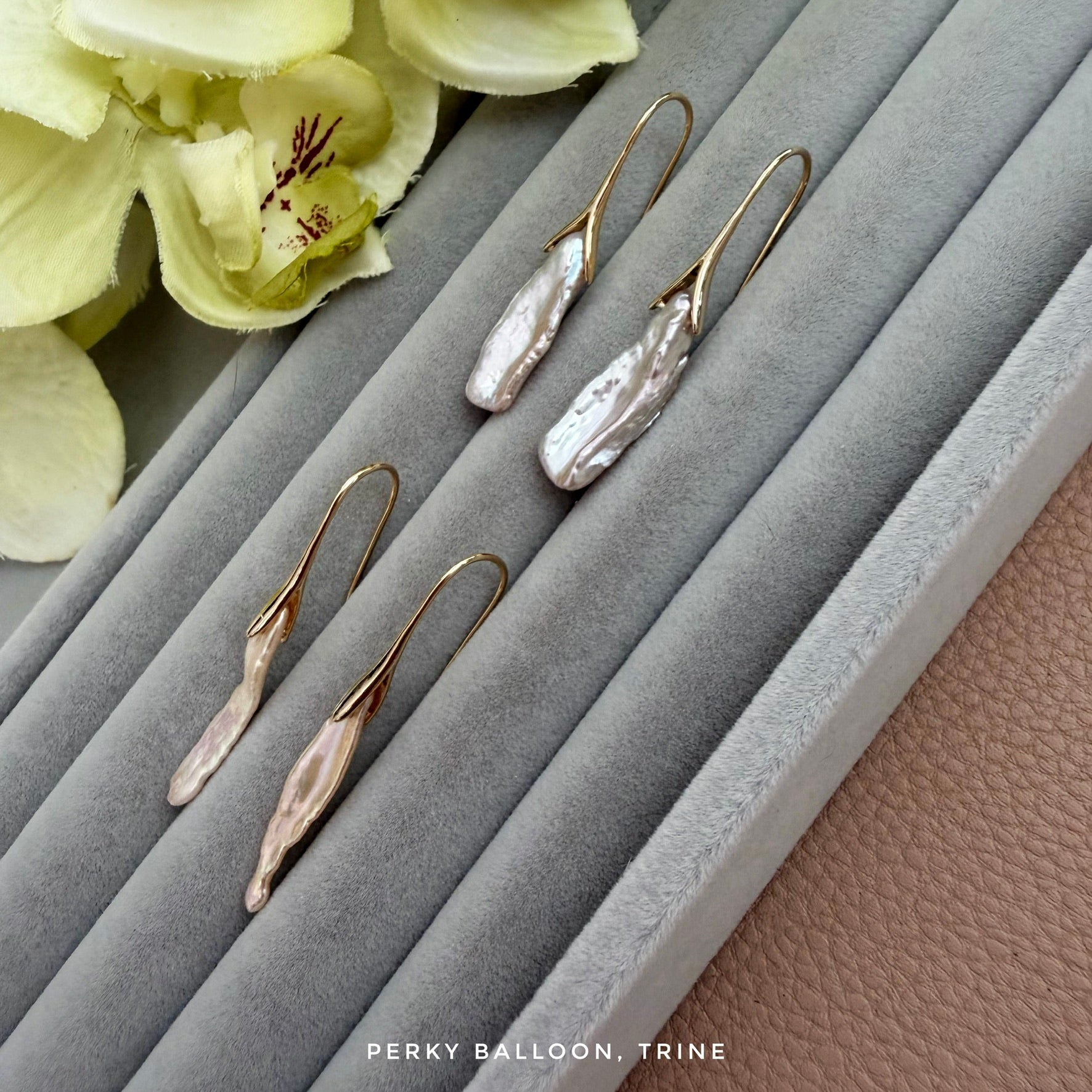 ~24mm長巴洛克淡水珍珠,有淡粉紫色/金屬粉橙,黃銅鍍金耳勾,整體高約4.5cm
