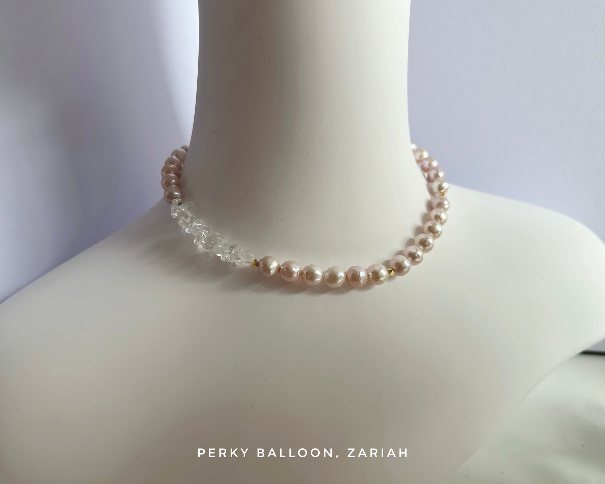8-9mm 巴洛克淡水珍珠+白水晶碎石,極淺粉紅色,係櫻花樹下少女嘅blush,係zephyr 吹出嚟嘅春風,頸鏈連扣長約40+5 cm